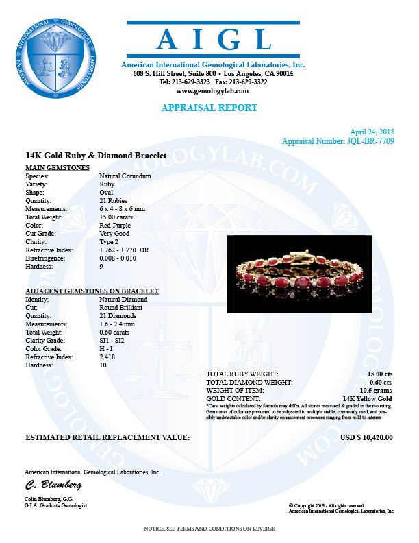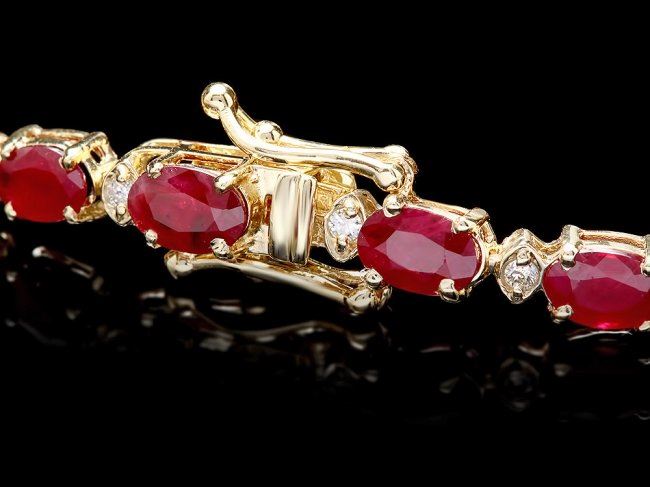 Retail: $10,300.00 ****** 14k Gold 15.00ct Ruby 0.60ct Diamond Bracelet ****** Metal: 14k Solid Yellow Gold / Size: 7.5 / Total Item Weight: 10.5 grams / Country Made: United States / / Main Stone: Ruby / Color: Red / Carat Total Weight: 15.00 / Treatment: None / Clarity: Type 2 / Cut: Very Good / / Secondary Stone: Diamond / Carat Total Weight: 0.60 / Treatment: None / Color Grade: H - I / Clarity: SI1 - SI2 / Cut: Very Good /