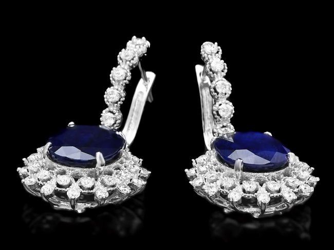 Retail: $8,900.00 ****** 14k Gold 15.00ct Sapphire 1.90ct Diamond Earrings ****** Metal: 14k Solid White Gold / Total Item Weight: 11.1 grams / Country Made: United States / / Main Stone: Sapphire / Color: Blue / Carat Total Weight: 15.00 / Treatment: Heating / Clarity: Type 2 / Cut: Very Good / / Secondary Stone: Diamond / Carat Total Weight: 1.90 / Treatment: None / Color Grade: G - H / Clarity: SI1 - SI2 / Cut: Very Good /