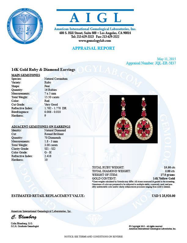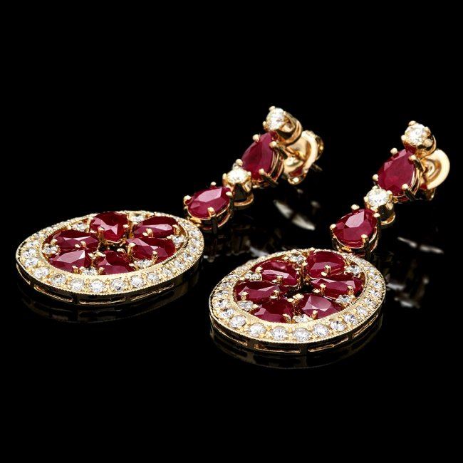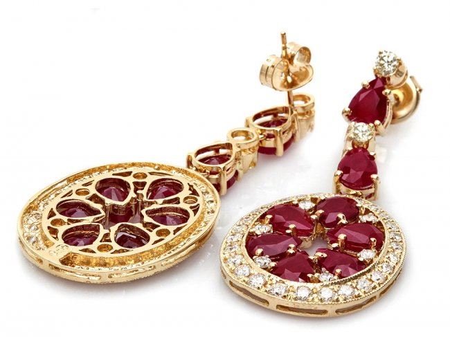 Retail: $25,800.00 ****** 14k Gold 15.50ct Ruby 3.00ct Diamond Earrings ****** Metal: 14k Solid Yellow Gold / Total Item Weight: 17.0 grams / Country Made: United States / / Main Stone: Ruby / Color: Red / Carat Total Weight: 15.50 / Treatment: None / Clarity: Type 2 / Cut: Very Good / / Secondary Stone: Diamond / Carat Total Weight: 3.00 / Treatment: None / Color Grade: G - H / Clarity: SI1 - SI2 / Cut: Very Good /