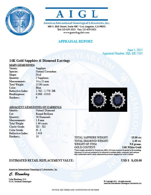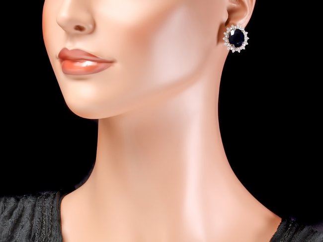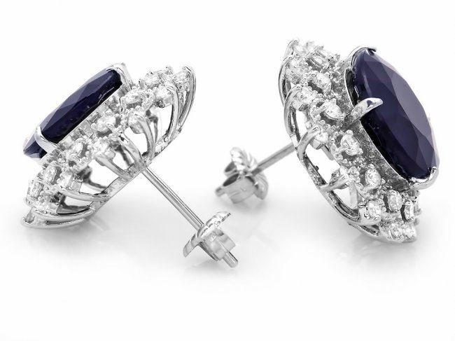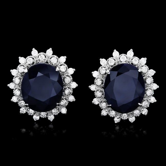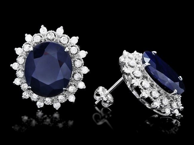 Retail: $8,300.00 ****** 14k Gold 15ct Sapphire 1.40ct Diamond Earrings ****** Metal: 14k Solid White Gold / Total Item Weight: 9.0 grams / Country Made: United States / / Main Stone: Sapphire / Color: Blue / Carat Total Weight: 15.00 / Treatment: Heating / Clarity: Type 2 / Cut: Very Good / / Secondary Stone: Diamond / Carat Total Weight: 1.40 / Treatment: None / Color Grade: H - I / Clarity: SI1 - SI2 / Cut: Very Good /
