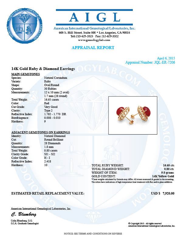 Retail: $7,800.00 ****** 14k Gold 16.65ct Ruby 0.80ct Diamond Earrings ****** Metal: 14k Solid Yellow Gold / Total Item Weight: 9.0 grams / Country Made: United States / / Main Stone: Ruby / Color: Red / Carat Total Weight: 16.00 / Treatment: Filling / Clarity: Type 2 / Cut: Very Good / / Secondary Stone: Diamond / Carat Total Weight: 0.80 / Treatment: None / Color Grade: H - I / Clarity: SI1 - SI2 / Cut: Very Good / / Side Stone: Ruby / Color: Red / Carat Total Weight: 0.65 / Treatment: None / Clarity: Type 2 / Cut: Very Good /