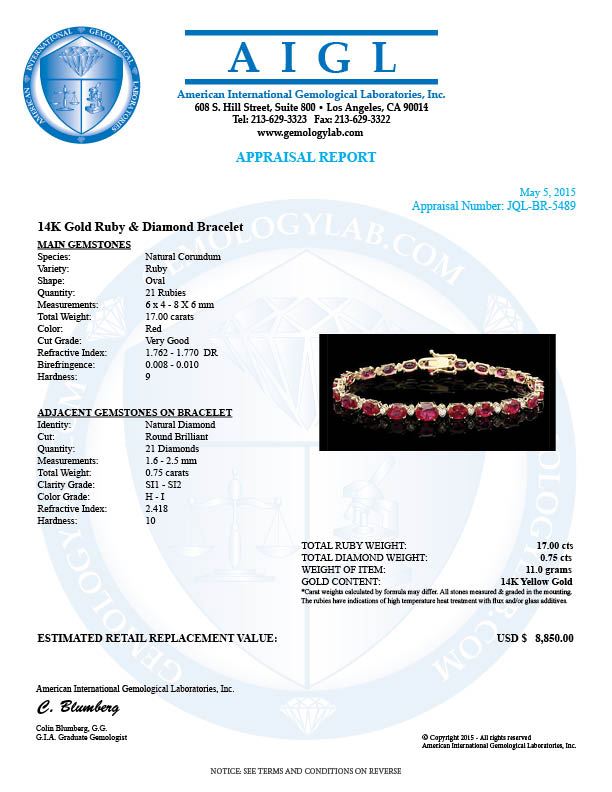 Retail: $8,900.00 ****** 14k Gold 17.00ct Ruby 0.75ct Diamond Bracelet ****** Metal: 14k Solid Yellow Gold / Size: 7.5 / Total Item Weight: 11.0 grams / Country Made: United States / / Main Stone: Ruby / Color: Red / Carat Total Weight: 17.00 / Treatment: Filling / Clarity: Type 2 / Cut: Very Good / / Secondary Stone: Diamond / Carat Total Weight: 0.75 / Treatment: None / Color Grade: H - I / Clarity: SI1 - SI2 / Cut: Very Good /