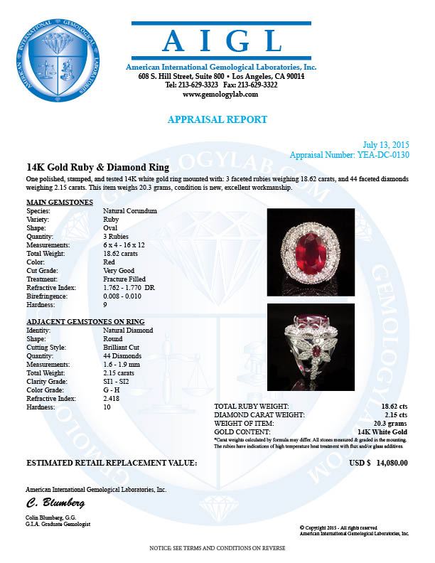 Retail: $14,080.00 ******14K Gold Ruby & Diamond Ring ****** Metal: 14K Solid White Gold / Total Item Weight: 20.3 grams / Country Made: United States / / Main Stone: Ruby / Color: Red / Carat Total Weight: 18.62 / Treatment: None / Clarity: Type 2 / Cut: Very Good / / Secondary Stone: Diamond / Carat Total Weight: 2.15 / Treatment: None / Color Grade: G -H / Clarity: SI1 -SI2 / Cut: Round Brilliant /