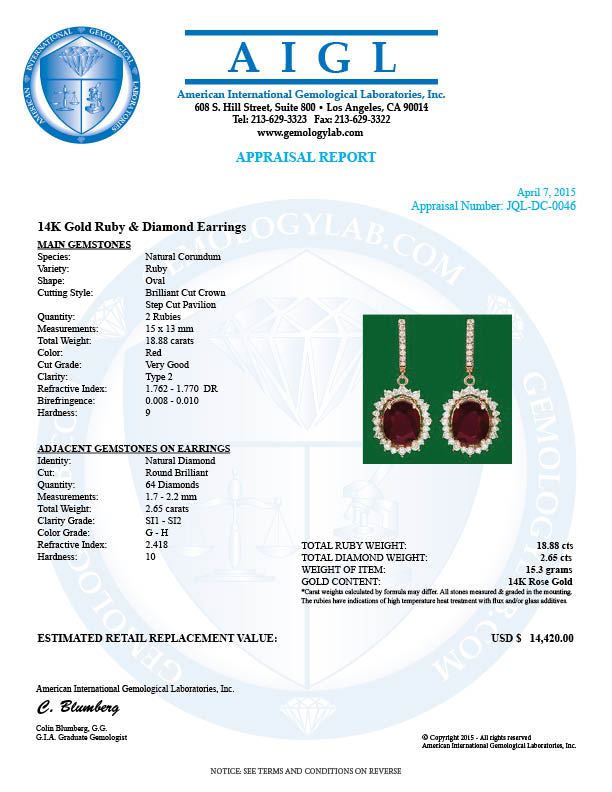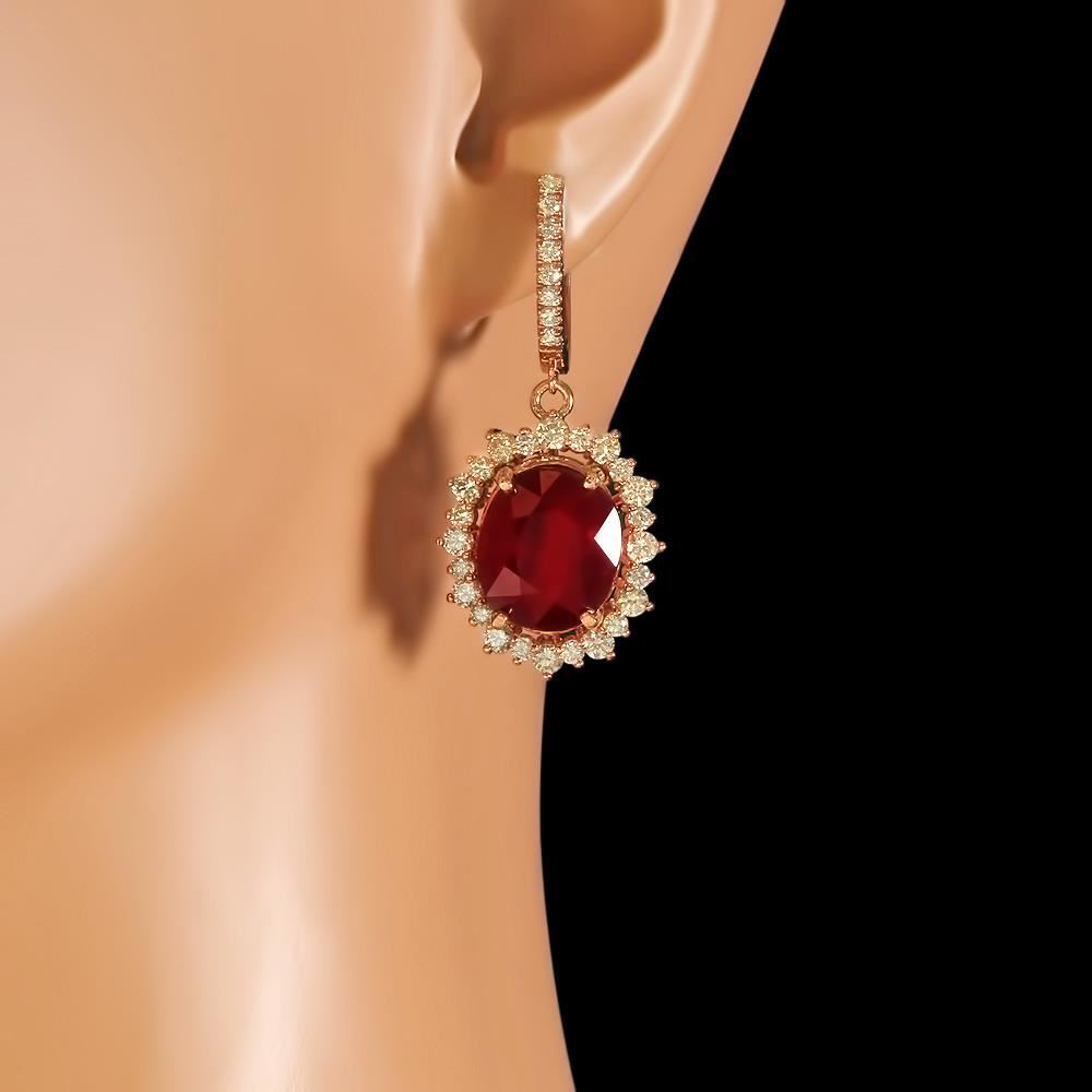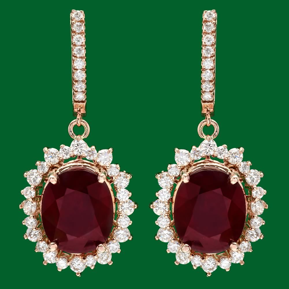 Retail: $14,420.00 ****** 14k Gold 18.88ct Ruby 2.65ct Diamond Earrings ****** Metal: 14k Solid Yellow Gold / Total Item Weight: 15.3 grams / Country Made: United States / / Main Stone: Ruby / Color: Red / Carat Total Weight: 18.88 / Treatment: None / Clarity: Type 2 / Cut: Very Good / / Secondary Stone: Diamond / Carat Total Weight: 2.65 / Treatment: None / Color Grade: G - H / Clarity: SI1 - SI2 / Cut: Round Brilliant /