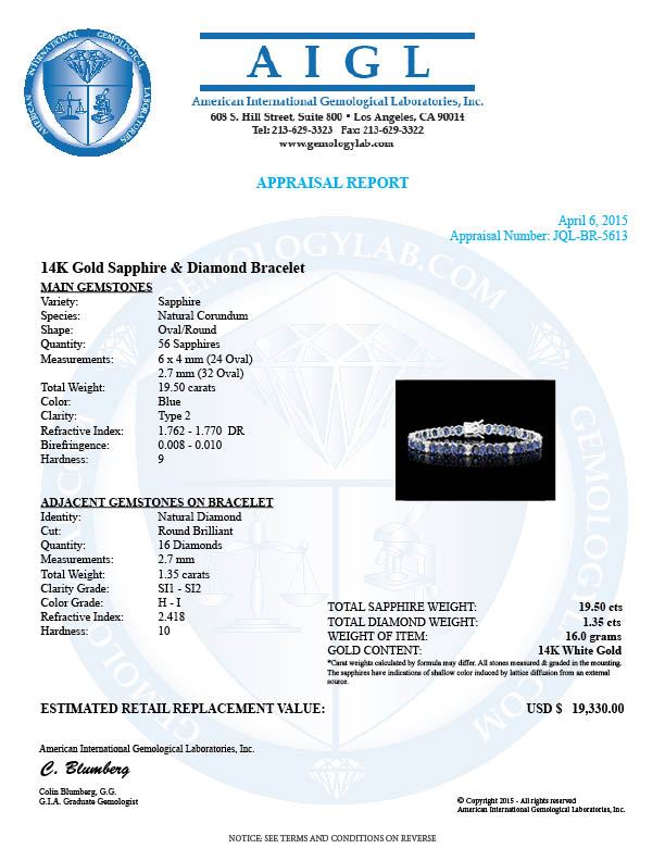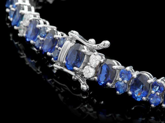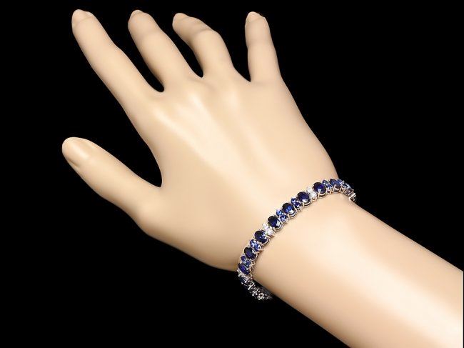 Retail: $19,250.00 ****** 14k Gold 19ct Sapphire 1.35ct Diamond Bracelet ****** Metal: 14k Solid White Gold / Size: 7 / Total Item Weight: 16.0 grams / Country Made: United States / / Main Stone: Sapphire / Color: Blue / Carat Total Weight: 14.50 / Treatment: Diffusion / Clarity: Type 2 / Cut: Very Good / / Secondary Stone: Diamond / Carat Total Weight: 1.35 / Treatment: None / Color Grade: H - I / Clarity: SI1 - SI2 / Cut: Very Good / / Side Stone: Sapphire / Color: Blue / Carat Total Weight: 5.00 / Treatment: Diffusion / Clarity: Type 2 / Cut: Very Good /