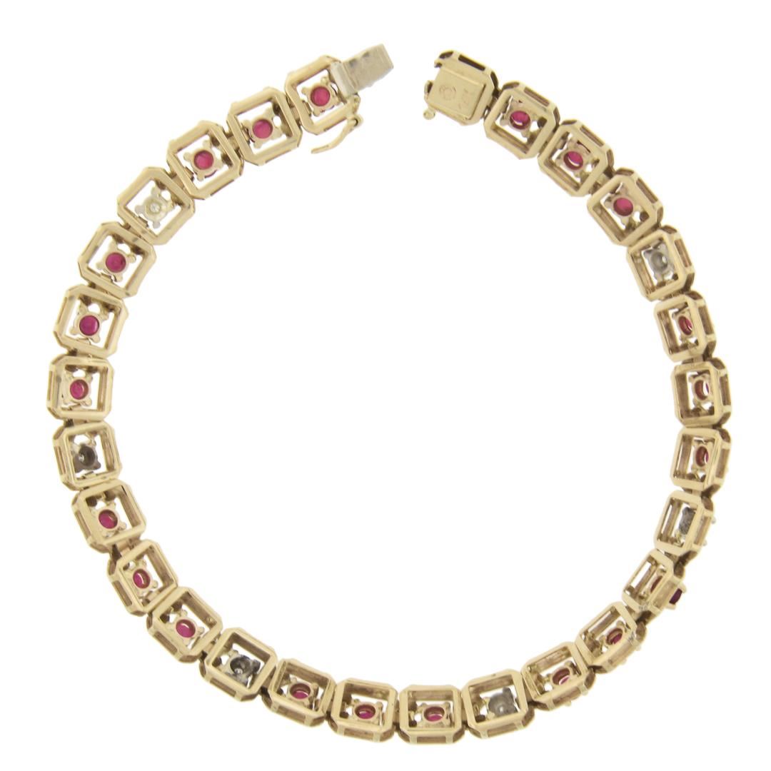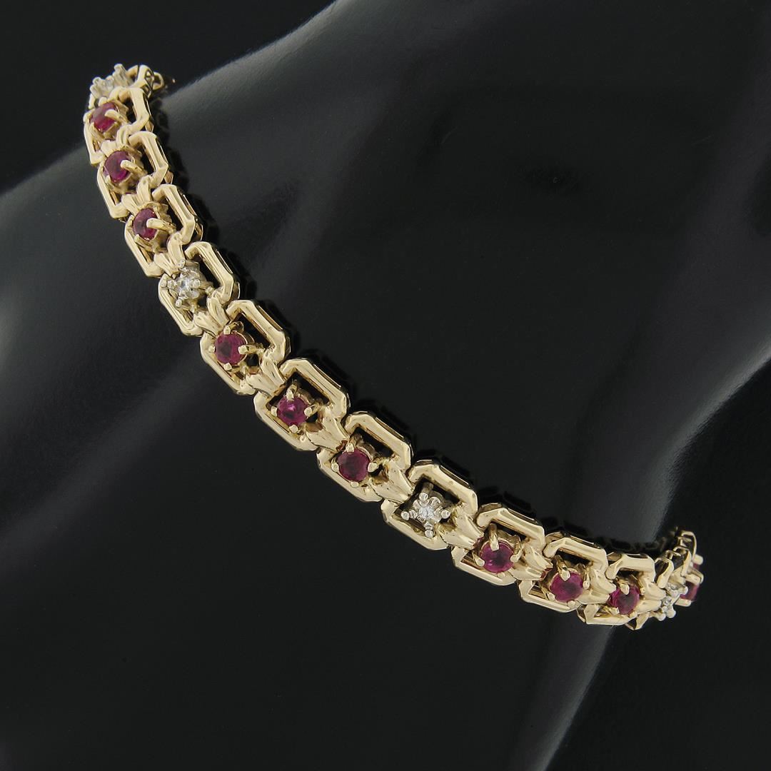 A solid 14k yellow gold square link chain bracelet, featuring 21 round cut natural rubies (2.0ctw), alternated with 7 round cut natural diamonds (G/H - SI2/I1 ; 0.14ctw). It weighs a total of 7.64 grams, measures 6.5mm wide, and measures 6.5 inches in length.