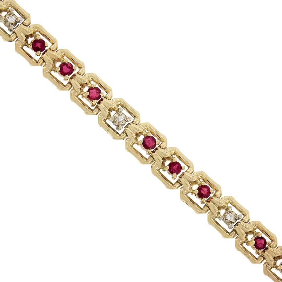 A solid 14k yellow gold square link chain bracelet, featuring 21 round cut natural rubies (2.0ctw), alternated with 7 round cut natural diamonds (G/H - SI2/I1 ; 0.14ctw). It weighs a total of 7.64 grams, measures 6.5mm wide, and measures 6.5 inches in length.
