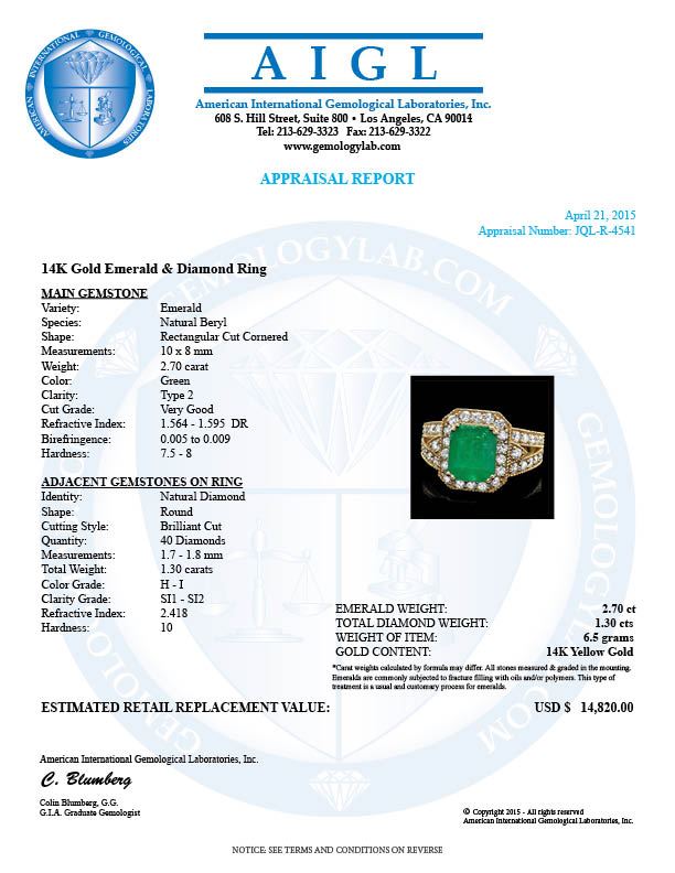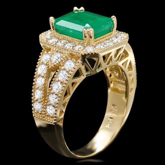 Retail: $14,700.00 ****** 14k Gold 2.70ct Emerald 1.30ct Diamond Ring ****** Metal: 14k Solid Yellow Gold / Size: 7.5 / Total Item Weight: 6.5 grams / Country Made: United States / / Main Stone: Emerald / Color: Green / Carat Total Weight: 2.70 / Treatment: None / Clarity: Type 2 / Cut: very Good / / Secondary Stone: Diamond / Carat Total Weight: 1.30 / Treatment: None / Color Grade: H - I / Clarity: SI1 - SI2 / Cut: Very Good /