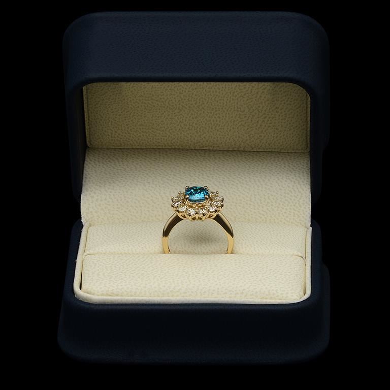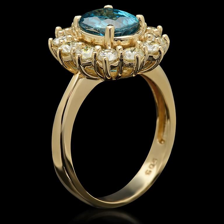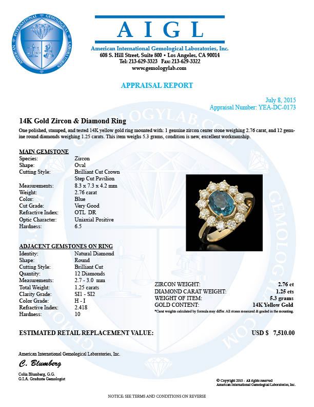 Retail: $7,510.00******14k Gold Zircon & Diamond Ring****** Metal: 14K Solid Yellow Gold / Total Item Weight: 5.3 grams / Country Made: United States / / Main Stone: Zircon/ Color: Blue / Carat Total Weight: 2.76 / Treatment: None / Clarity: Type 2 / Cut: Very Good / / Secondary Stone: Diamond / Carat Total Weight: 1.25 / Treatment: None / Color Grade: H - I / Clarity: SI1 - SI2 / Cut: Round Brilliant /