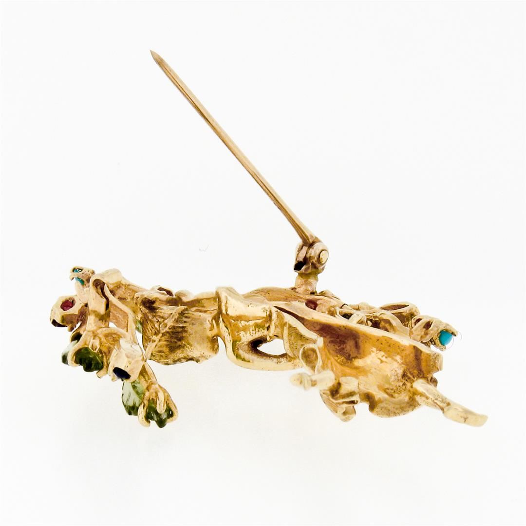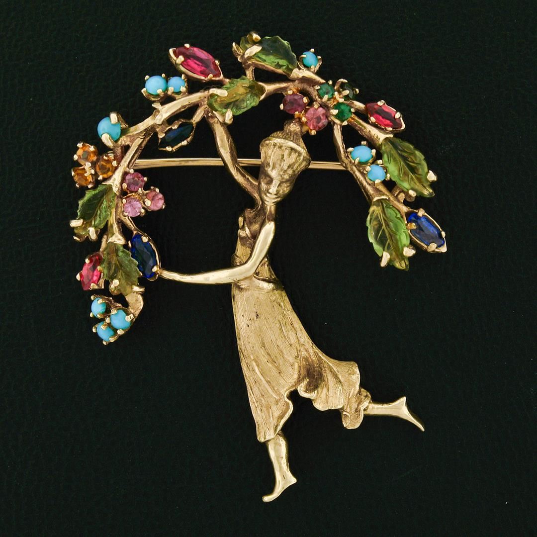 A vintage solid 14k yellow gold lady wreath pin brooch, featuring 6 carved leaf cut natural peridots (1.50ctw), 3 old marquise cut natural rubies (0.54ctw), 3 old marquise cut natural sapphires (0.40ctw), 3 old round cut natural citrines (0.15ctw), 3 old round cut natural emeralds (0.12ctw ), 5 round old cut natural sapphires (0.25ctw), and 9 round cabochon cut natural turquoise (2.0- 2.5mm). Measures 48.5x39.7mm and weighs a total of 12.45 grams.