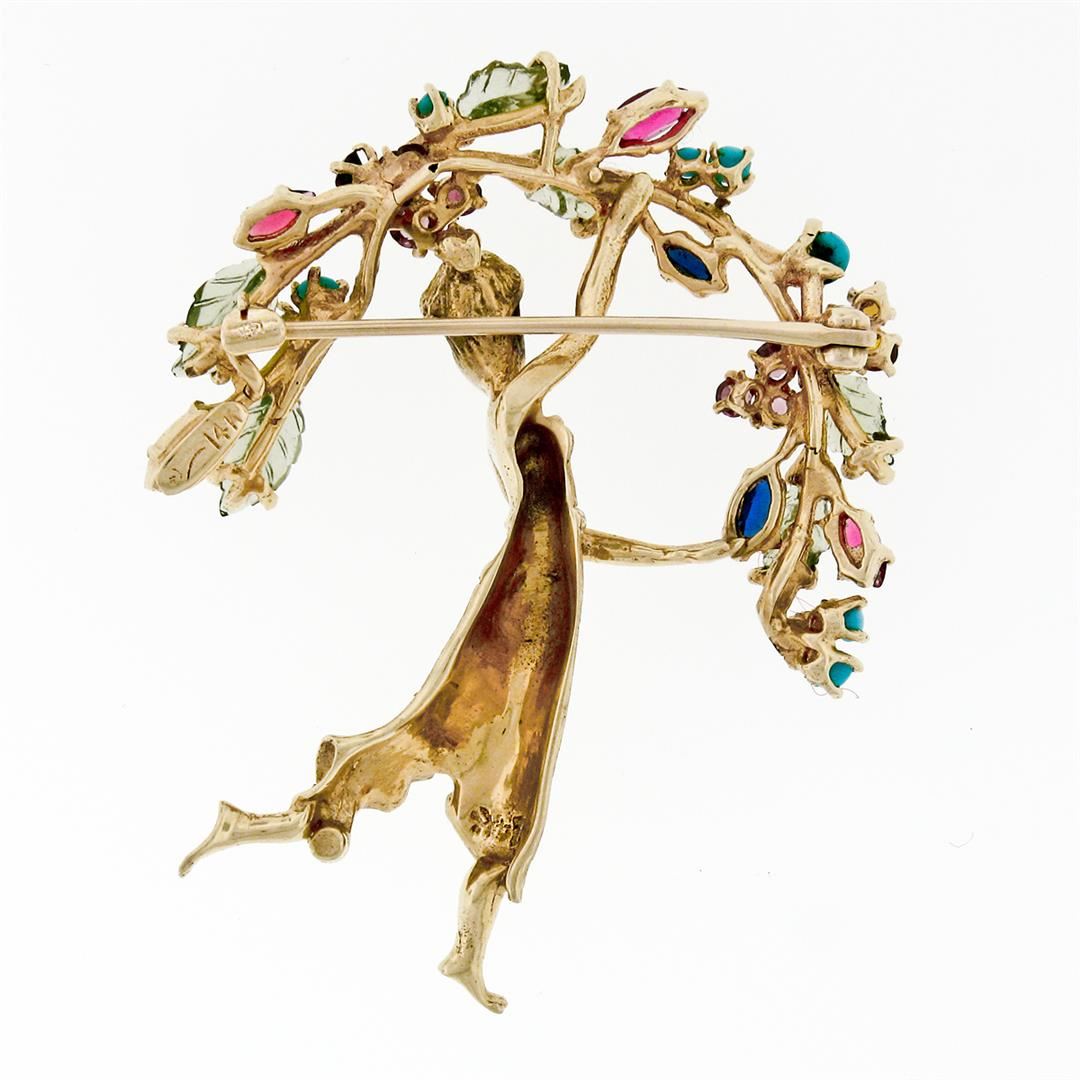 A vintage solid 14k yellow gold lady wreath pin brooch, featuring 6 carved leaf cut natural peridots (1.50ctw), 3 old marquise cut natural rubies (0.54ctw), 3 old marquise cut natural sapphires (0.40ctw), 3 old round cut natural citrines (0.15ctw), 3 old round cut natural emeralds (0.12ctw ), 5 round old cut natural sapphires (0.25ctw), and 9 round cabochon cut natural turquoise (2.0- 2.5mm). Measures 48.5x39.7mm and weighs a total of 12.45 grams.