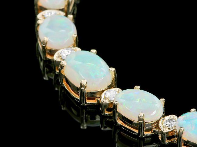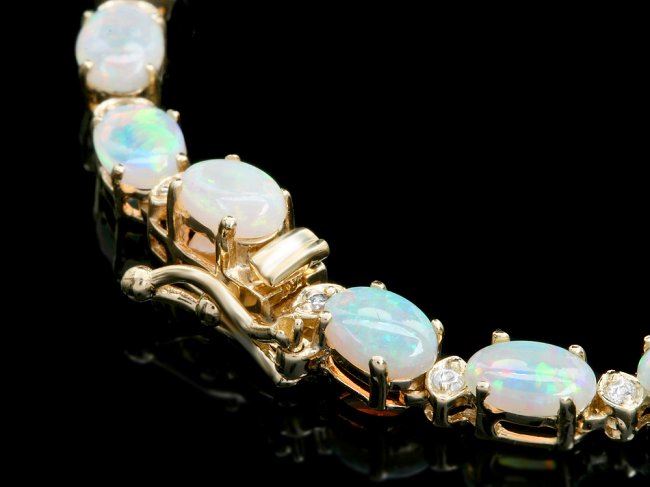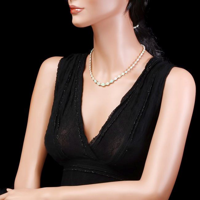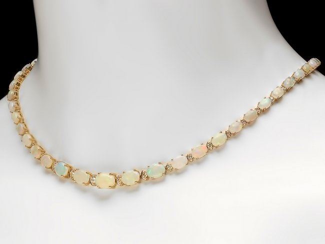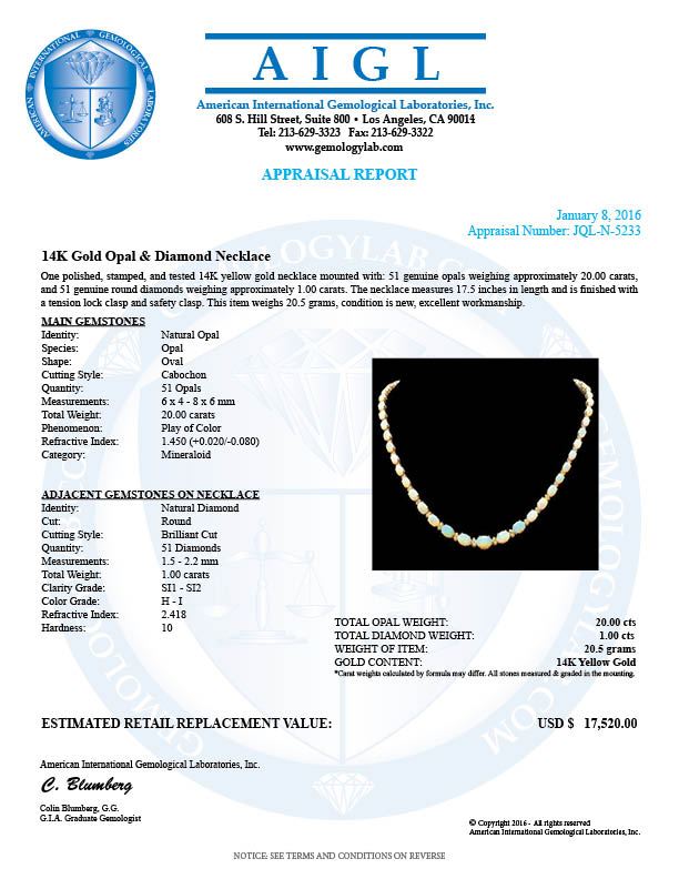 Retail: $17,400.00 ****** 14k Gold 20.00ct Opal 1.00ct Diamond Necklace ****** Metal: 14k Solid Yellow Gold / Size: 17.5 / Total Item Weight: 20.5 grams / Country Made: United States / / Main Stone: Opal / Color: Multi-Colored / Carat Total Weight: 20.00 / Treatment: None / Origin: Australia / Type: Crystal / Toughness: Good / / Secondary Stone: Diamond / Carat Total Weight: 1.00 / Treatment: None / Color Grade: H - I / Clarity: SI1 - SI2 / Cut: Very Good /