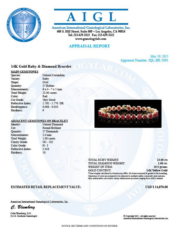 Retail: $14,750.00 ****** 14k Gold 23.00ct Ruby 1.00ct Diamond Bracelet ****** Metal: 14k Solid Yellow Gold / Size: 7.75 / Total Item Weight: 19.5 grams / Country Made: United States / / Main Stone: Ruby / Color: Red / Carat Total Weight: 23.00 / Treatment: None / Clarity: Type 2 / Cut: Very Good / / Secondary Stone: Diamond / Carat Total Weight: 1.00 / Treatment: None / Color Grade: H - I / Clarity: SI1 - SI2 / Cut: Very Good /