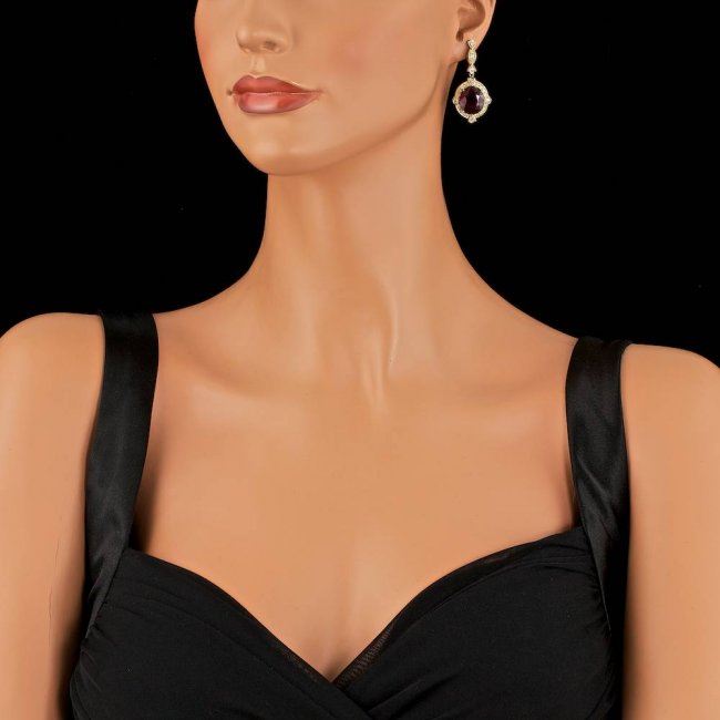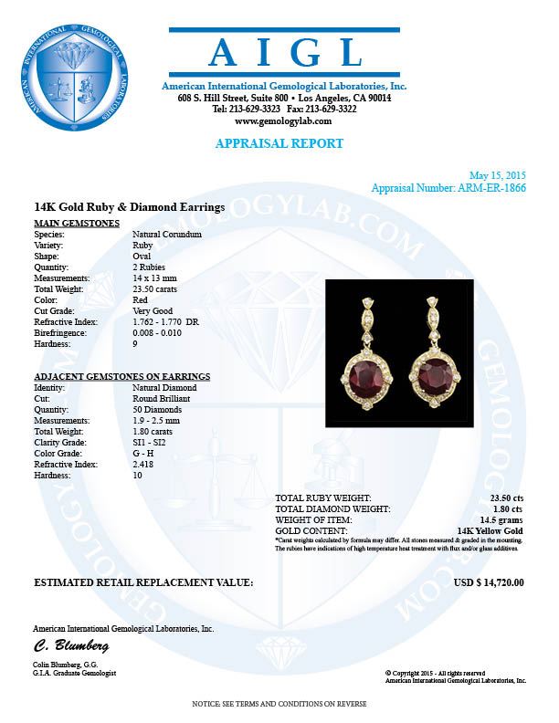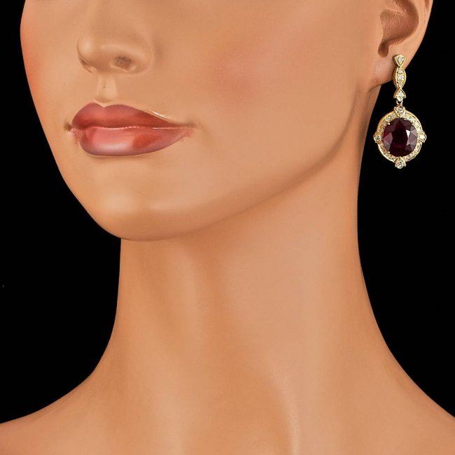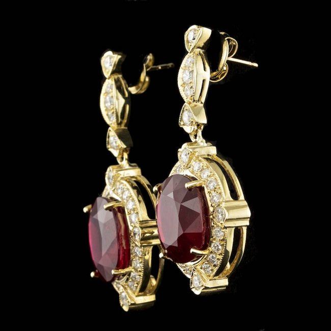 Retail: $14,600.00 ****** 14k Gold 23.50ct Ruby 1.80ct Diamond Earrings ****** Metal: 14k Solid Yellow Gold / Total Item Weight: 14.5 grams / Country Made: United States / / Main Stone: Ruby / Color: Red / Carat Total Weight: 23.50 / Treatment: Filling / Clarity: Type 2 / Cut: Very Good / / Secondary Stone: Diamond / Carat Total Weight: 1.80 / Treatment: None / Color Grade: G - H / Clarity: SI1 - SI2 / Cut: Very Good /