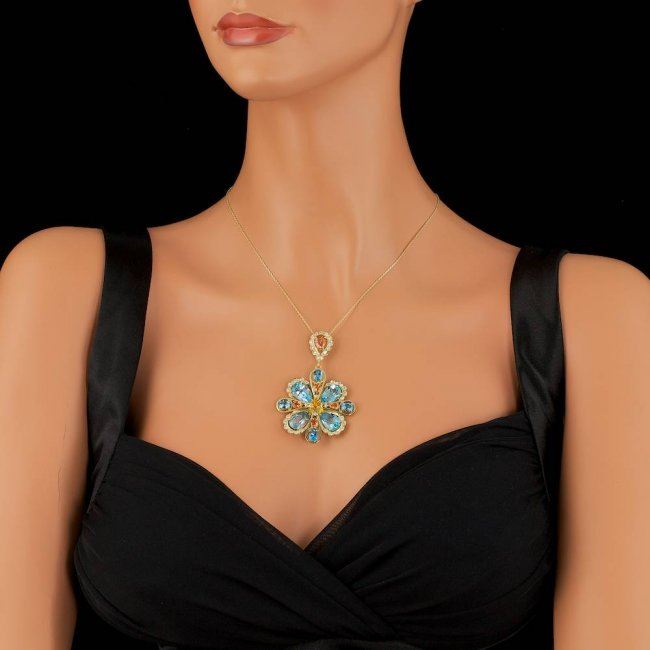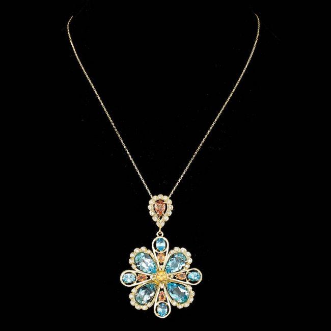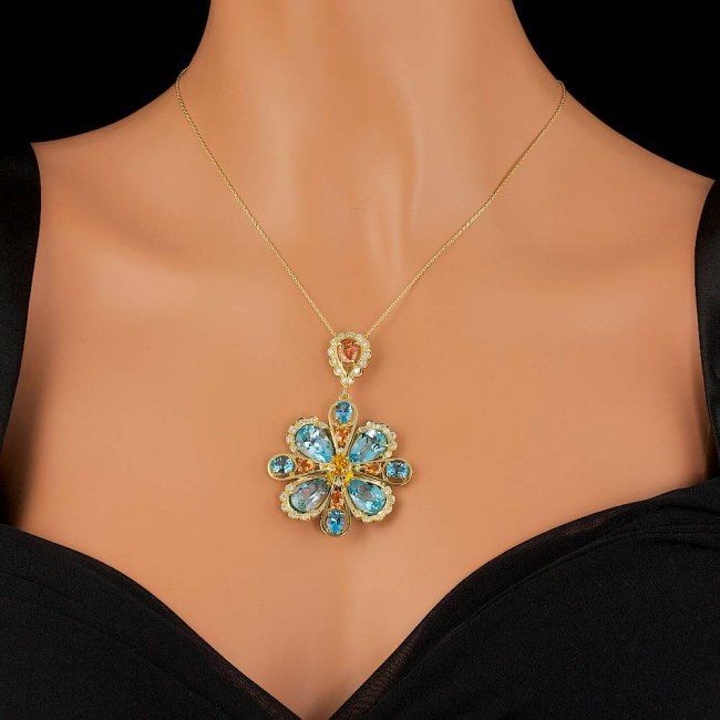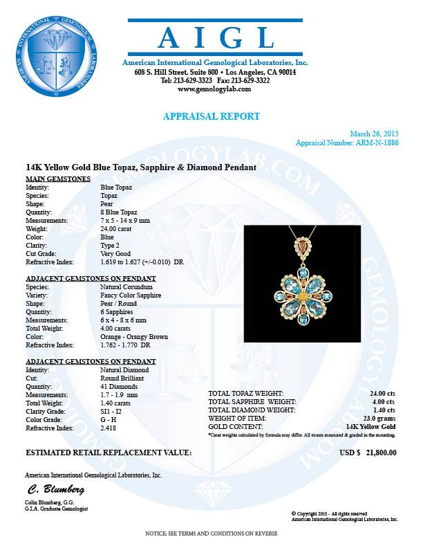 Retail: $21,800.00 ****** 14k Gold 24.00ct Topaz 1.40ct Diamond Pendant ****** Metal: 14k Solid Yellow Gold / Size: 18 / Total Item Weight: 23.0 grams / Country Made: United States / / Main Stone: Topaz / Color: Blue / Carat Total Weight: 24.00 / Treatment: None / Clarity: Type 2 / Cut: Very Good / / Secondary Stone: Diamond / Carat Total Weight: 1.40 / Treatment: None / Color Grade: G - H / Clarity: SI1 - SI2 / Cut: Very Good / / Side Stone: Sapphire / Color: Orange / Carat Total Weight: 4.00 / Treatment: Heating / Clarity: Type 2 / Cut: Very Good /