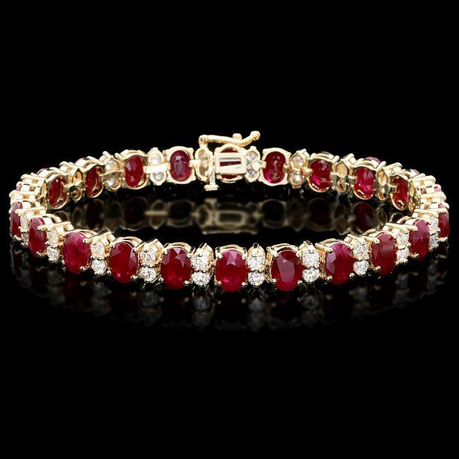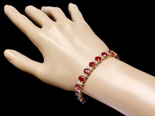 Retail: $28,900.00 ****** 14k Gold 24.50ct Ruby 3.80ct Diamond Bracelet ****** Metal: 14k Solid Yellow Gold / Size: 7.25 / Total Item Weight: 24.0 grams / Country Made: United States / / Main Stone: Ruby / Color: Red / Carat Total Weight: 24.50 / Treatment: None / Clarity: Type 2 / Cut: Very Good / / Secondary Stone: Diamond / Carat Total Weight: 3.80 / Treatment: None / Color Grade: H - I / Clarity: SI1 - SI2 / Cut: Very Good /