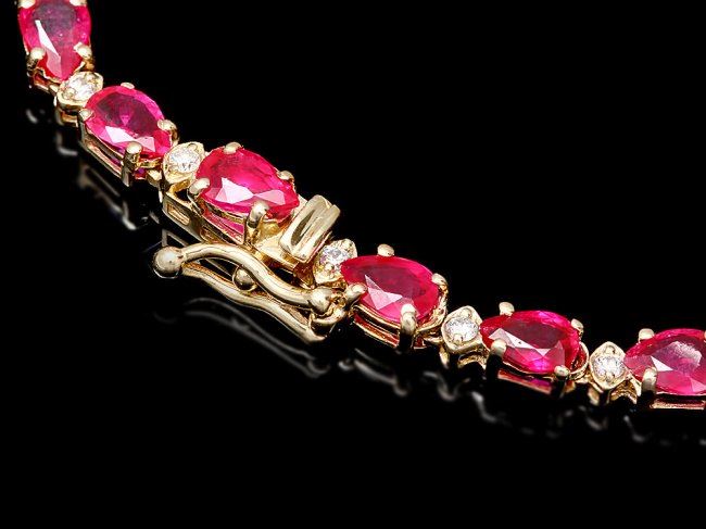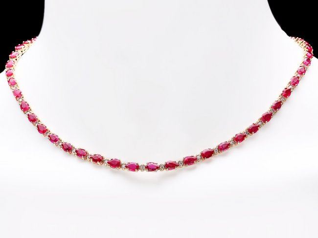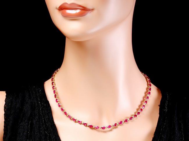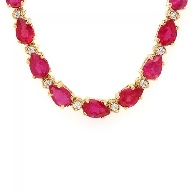 Retail: $16,900.00 ****** 14k Gold 25.00ct Ruby 1.20ct Diamond Necklace ****** Metal: 14k Solid Yellow Gold / Size: 17 / Total Item Weight: 20.0 grams / Country Made: United States / / Main Stone: Ruby / Color: Red / Carat Total Weight: 25.00 / Treatment: Filling / Clarity: Type 2 / Cut: Very Good / / Secondary Stone: Diamond / Carat Total Weight: 1.20 / Treatment: None / Color Grade: H - I / Clarity: SI1 - SI2 / Cut: Very Good /