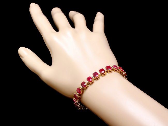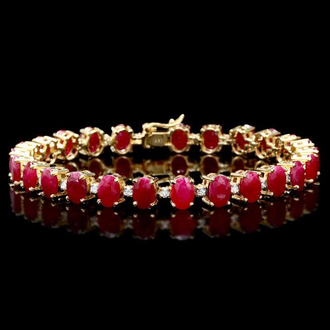 Retail: $16,700.00 ****** 14k Gold 26.00ct Ruby 1.00ct Diamond Bracelet ****** Metal: 14k Solid Yellow Gold / Size: 7.5 / Total Item Weight: 20 grams / Country Made: United States / / Main Stone: Ruby / Color: Red / Carat Total Weight: 26.00 / Treatment: None / Clarity: Type 2 / Cut: Very Good / / Secondary Stone: Diamond / Carat Total Weight: 1.00 / Treatment: None / Color Grade: H - I / Clarity: SI1 - SI2 / Cut: Very Good /