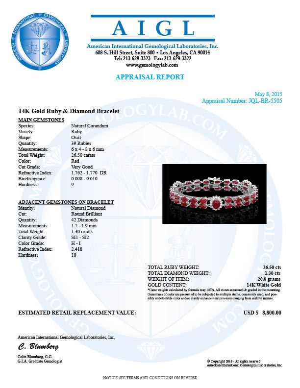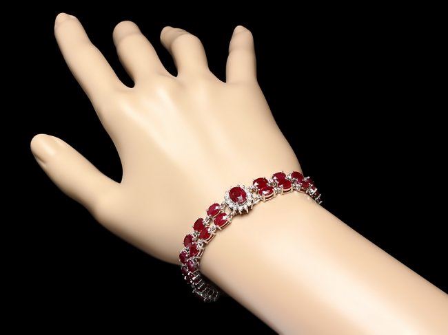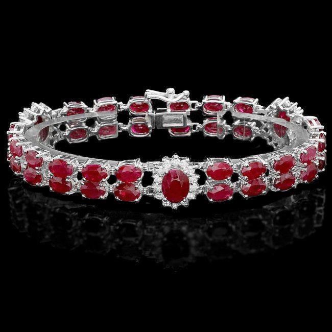 Retail: $18,400.00 ****** 14k Gold 26.5ct Ruby 1.30ct Diamond Bracelet ****** Metal: 14k Solid White Gold / Size: 7 / Total Item Weight: 20.0 grams / Country Made: United States / / Main Stone: Ruby / Color: Red / Carat Total Weight: 4.50 / Treatment: None / Clarity: Type 2 / Cut: Very Good / / Secondary Stone: Diamond / Carat Total Weight: 1.30 / Treatment: None / Color Grade: H - I / Clarity: SI1 - SI2 / Cut: Very Good / / Side Stone: Ruby / Color: Red / Carat Total Weight: 22.00 / Treatment: None / Clarity: Type 2 / Cut: Very Good /