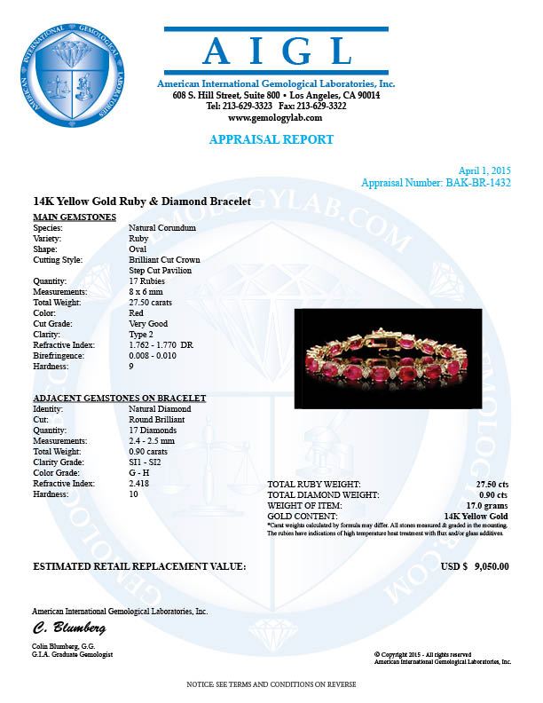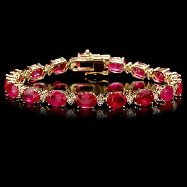 Retail: $8,900.00 ****** 14k Gold 27.50ct Ruby 0.90ct Diamond Bracelet ****** Metal: 14k Solid Yellow Gold / Size: 7 / Total Item Weight: 17.0 grams / Country Made: United States / / Main Stone: Ruby / Color: Red / Carat Total Weight: 27.50 / Treatment: Filling / Clarity: Type 2 / Cut: Very Good / / Secondary Stone: Diamond / Carat Total Weight: 0.90 / Treatment: None / Color Grade: G - H / Clarity: SI1 - SI2 / Cut: Very Good /