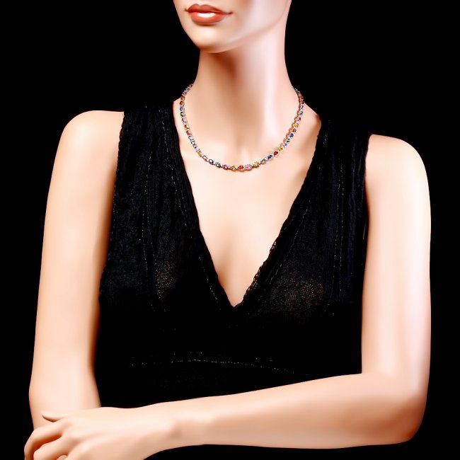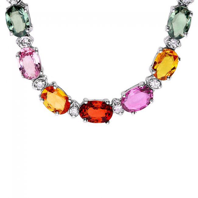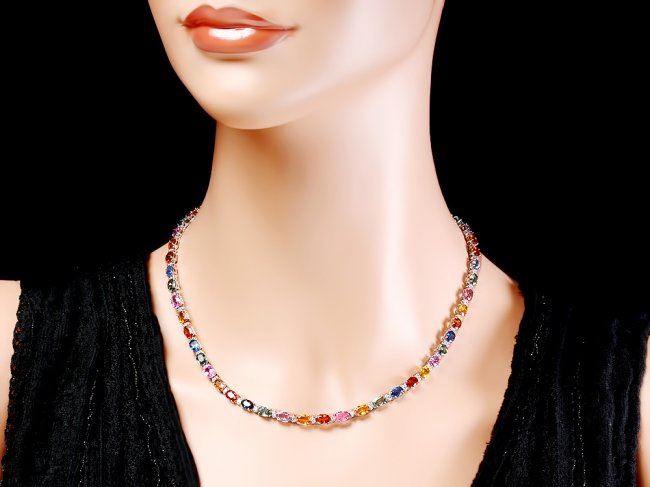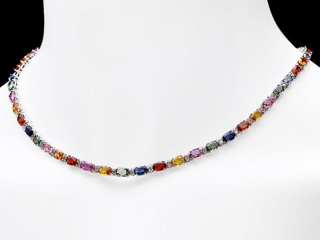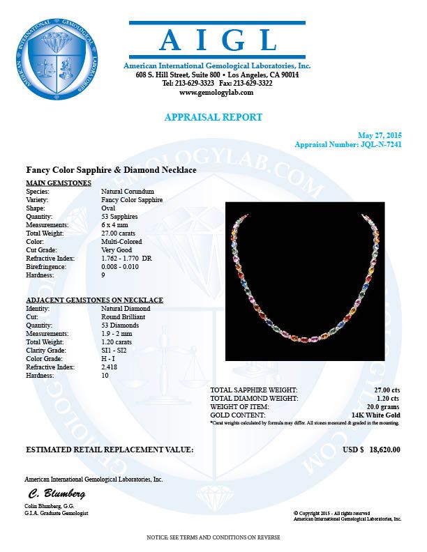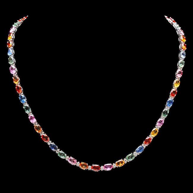 Retail: $18,500.00 ****** 14k Gold 27ct Sapphire 1.20ct Diamond Necklace ****** Metal: 14k Solid White Gold / Size: 17 / Total Item Weight: 20.0 grams / Country Made: United States / / Main Stone: Sapphire / Color: Multi-Colored / Carat Total Weight: 27.00 / Treatment: Heating / / Secondary Stone: Diamond / Carat Total Weight: 1.20 / Treatment: None / Color Grade: H - I / Clarity: SI1 - SI2 / Cut: Very Good /