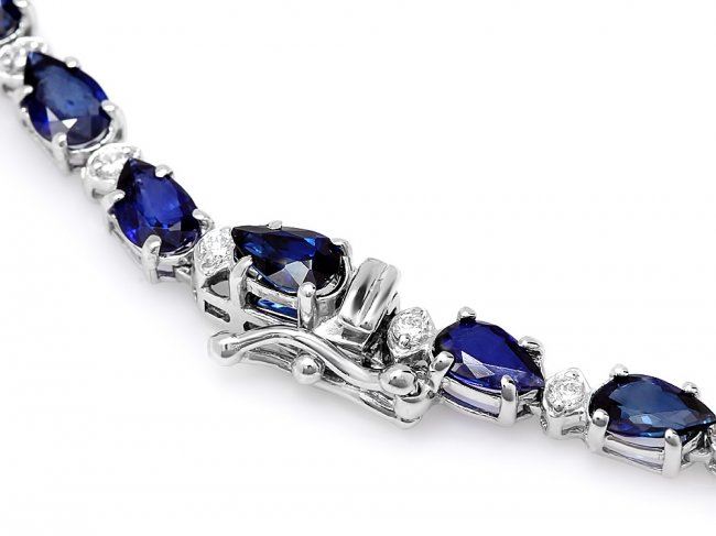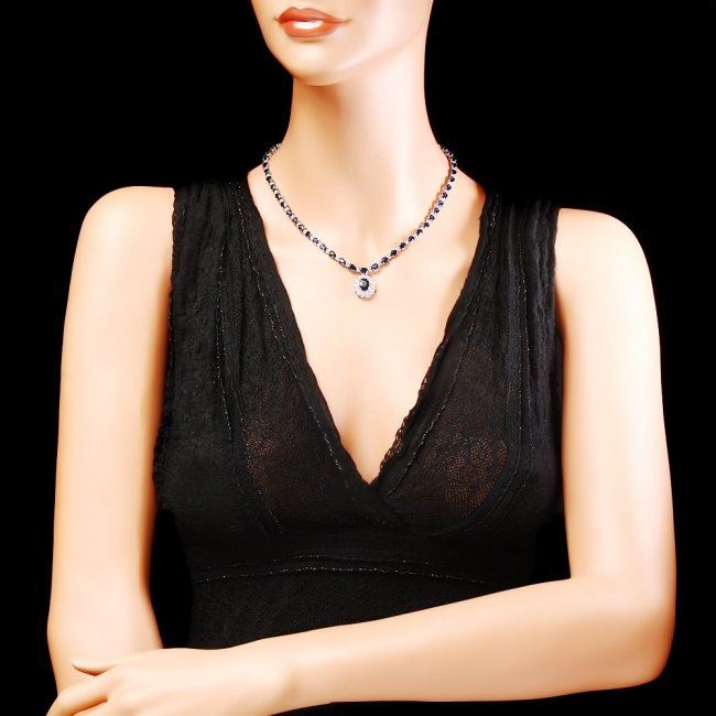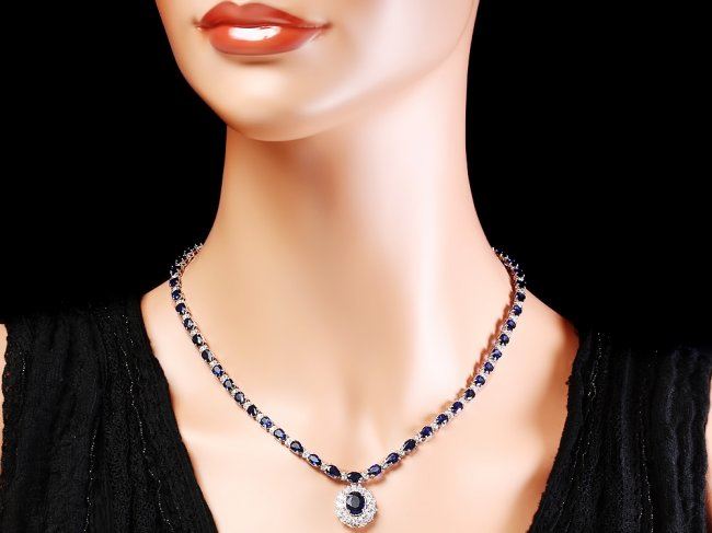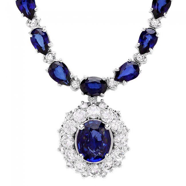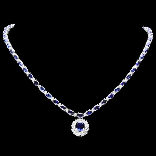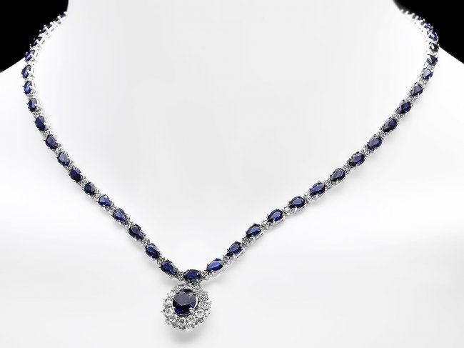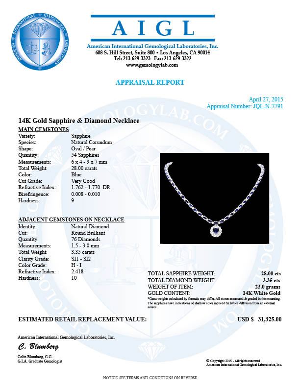 Retail: $31,200.00 ****** 14k Gold 28ct Sapphire 3.35ct Diamond Necklace ****** Metal: 14k Solid White Gold / Size: 17 / Total Item Weight: 23.0 grams / Country Made: United States / / Main Stone: Sapphire / Color: Blue / Carat Total Weight: 3.50 / Treatment: Diffusion / Clarity: Type 2 / Cut: Very Good / / Secondary Stone: Diamond / Carat Total Weight: 3.35 / Treatment: None / Color Grade: H - I / Clarity: SI1 - SI2 / Cut: Very Good / / Side Stone: Sapphire / Color: Blue / Carat Total Weight: 24.50 / Treatment: Diffusion / Clarity: Type 2 / Cut: Very Good /