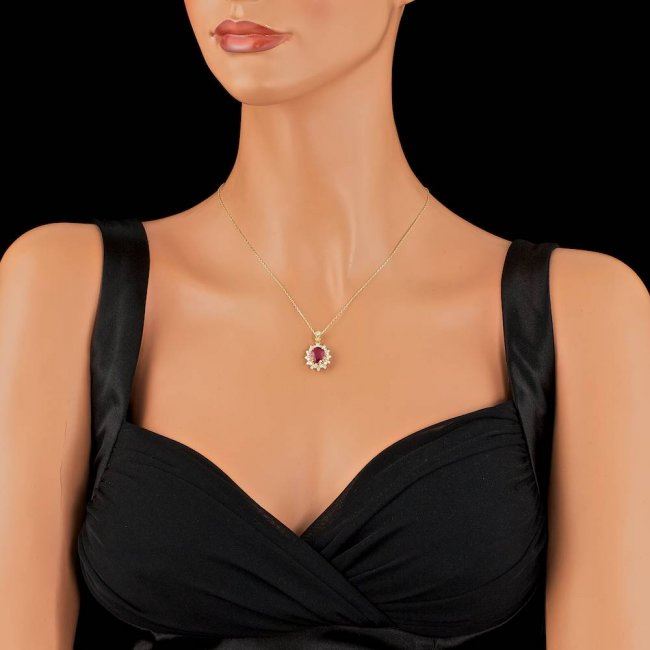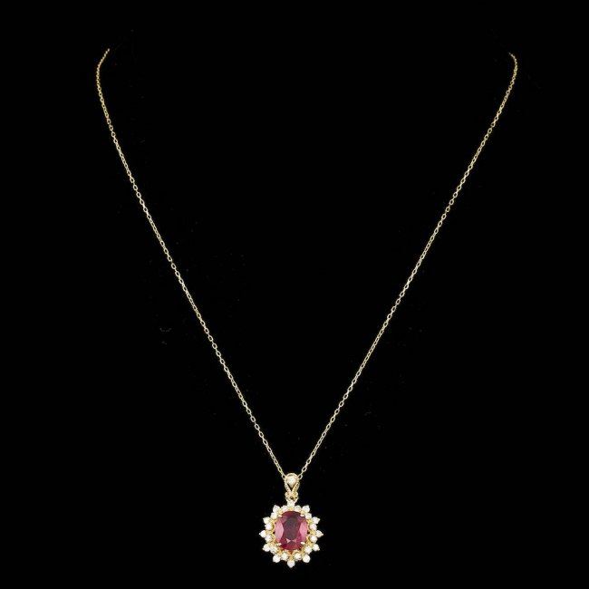 Retail: $4,500.00 ****** 14k Gold 3.00ct Ruby 0.70ct Diamond Pendant ****** Metal: 14k Solid Yellow Gold / Size: 18 / Total Item Weight: 4.0 grams / Country Made: United States / / Main Stone: Ruby / Color: Pink / Carat Total Weight: 3.00 / Treatment: Filling / Clarity: Type 2 / Cut: Very Good / / Secondary Stone: Diamond / Carat Total Weight: 0.70 / Treatment: None / Color Grade: G - H / Clarity: SI1 - SI2 / Cut: Very Good /