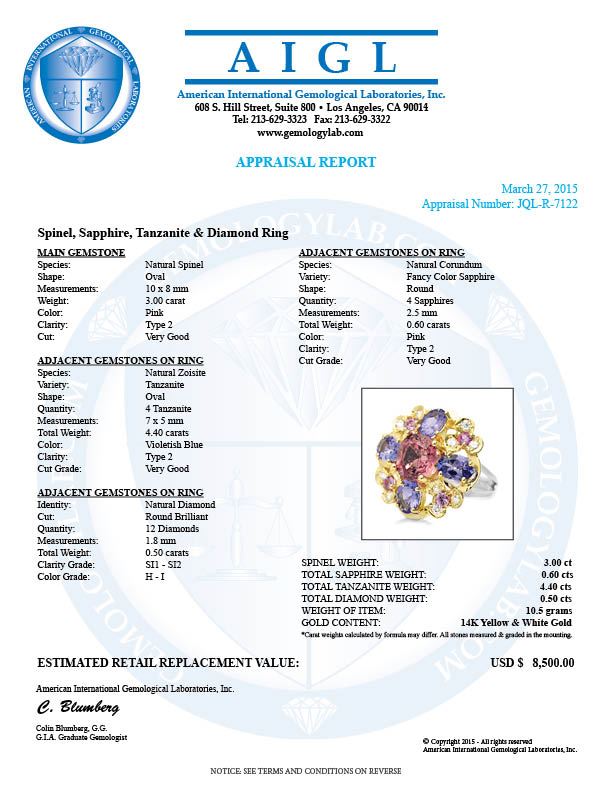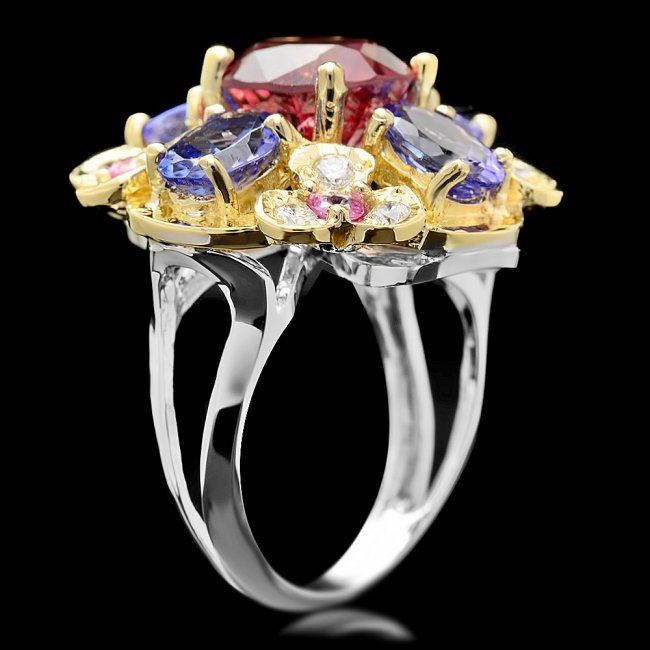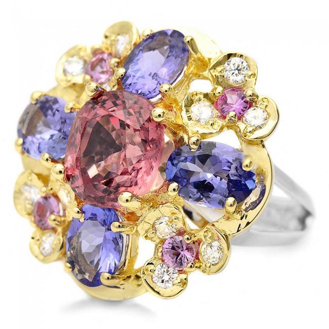 Retail: $8,500.00 ****** 14k Gold 3.00ct Spinel 0.50ct Diamond Ring ****** Metal: 14k Solid Multi-Tone Gold / Size: 7 / Total Item Weight: 10.5 grams / Country Made: United States / / Main Stone: Spinel / Color: Pink / Carat Total Weight: 3.00 / Treatment: None / Clarity: Type 2 / Cut: Very Good / / Secondary Stone: Diamond / Carat Total Weight: 0.50 / Treatment: None / Color Grade: H - I / Clarity: SI1 - SI2 / Cut: Very Good / / Side Stone: Tanzanite, Sapphire / Color: Purple, Pink / Carat Total Weight: 5.00 / Treatment: Not Enhanced, Heating / Clarity: Type 2 / Cut: Very Good /