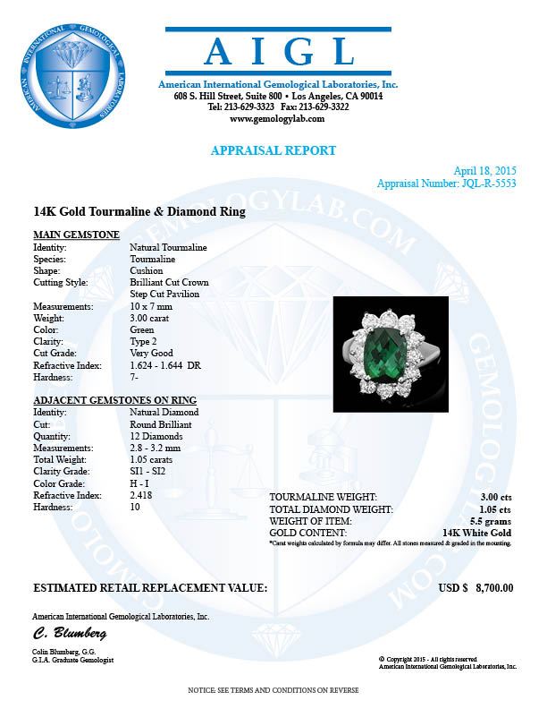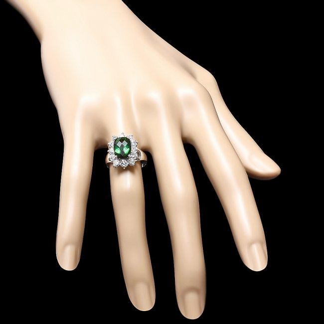 Retail: $8,650.00 ****** 14k Gold 3.00ct Tourmaline 1.05ct Diamond Ring ****** Metal: 14k Solid White Gold / Total Item Weight: 5.5 grams / Country Made: United States / / Main Stone: Tourmaline / Color: Green / Carat Total Weight: 3.00 / Treatment: None / Clarity: Type 2 / Cut: Very Good / / Secondary Stone: Diamond / Carat Total Weight: 1.05 / Treatment: None / Color Grade: H - I / Clarity: SI1 - SI2 / Cut: Very Good /