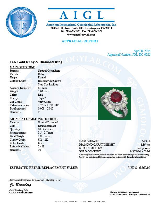 Retail: $6,760.00 ****** 14k Gold 3.02ct Ruby 1.85ct Diamond Ring ****** Metal: 14k Solid White Gold / Total Item Weight: 6.8 grams / Country Made: United States / / Main Stone: Ruby / Color: Red / Carat Total Weight: 3.02 / Treatment: None / Clarity: Type 2 / Cut: Very Good / / Secondary Stone: Diamond / Carat Total Weight: 1.85 / Treatment: None / Color Grade: G - J / Clarity: SI1 - SI2 / Cut: Round Brilliant /