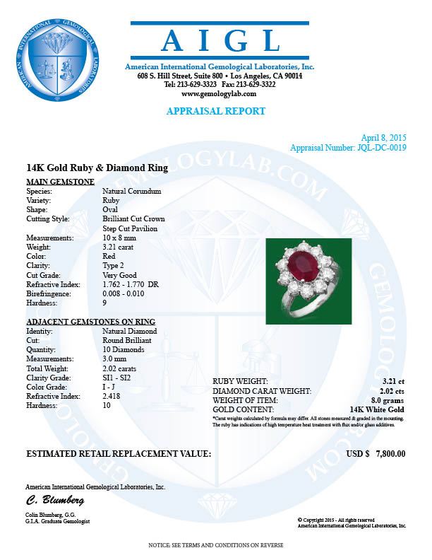 Retail: $7,800.00 ****** 14k Gold 3.21ct Ruby 2.02ct Diamond Ring ****** Metal: 14k Solid White Gold / Size: 7 / Total Item Weight: 8.0 grams / Country Made: United States / / Main Stone: Ruby / Color: Red / Carat Total Weight: 3.21 / Treatment: None / Clarity: Type 2 / Cut: Very Good / / Secondary Stone: Diamond / Carat Total Weight: 2.02 / Treatment: None / Color Grade: I - J / Clarity: SI1 - SI2 / Cut: Round Brilliant /