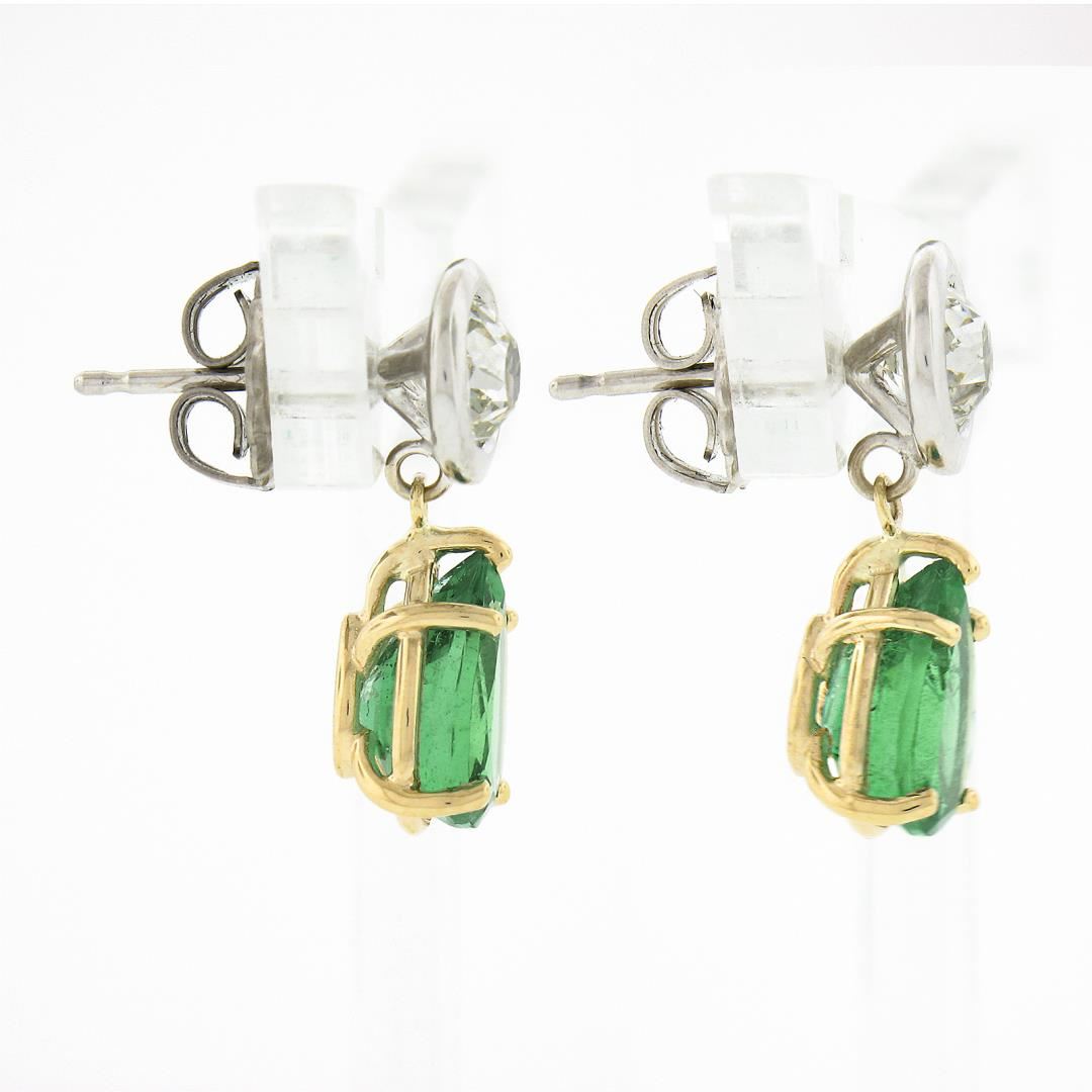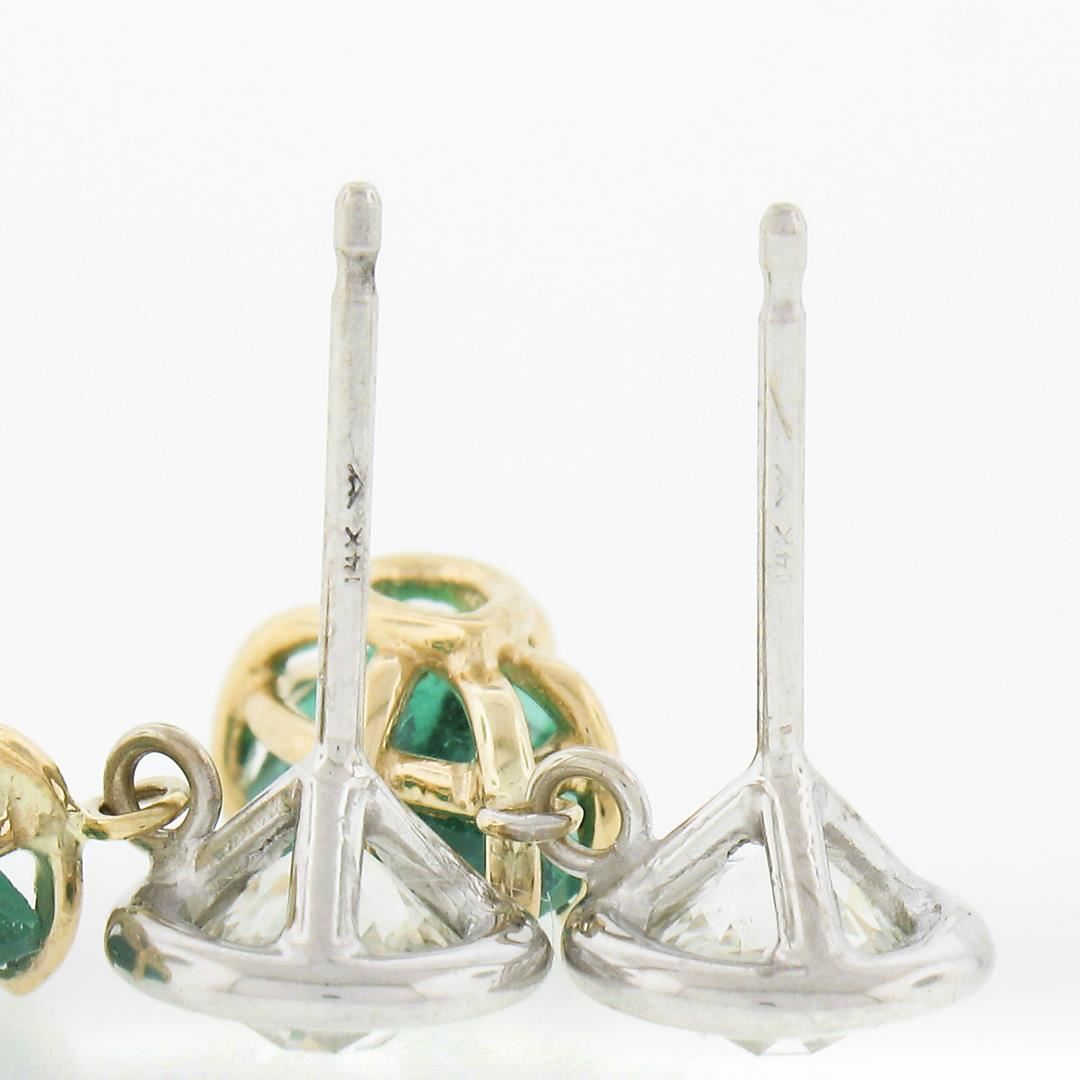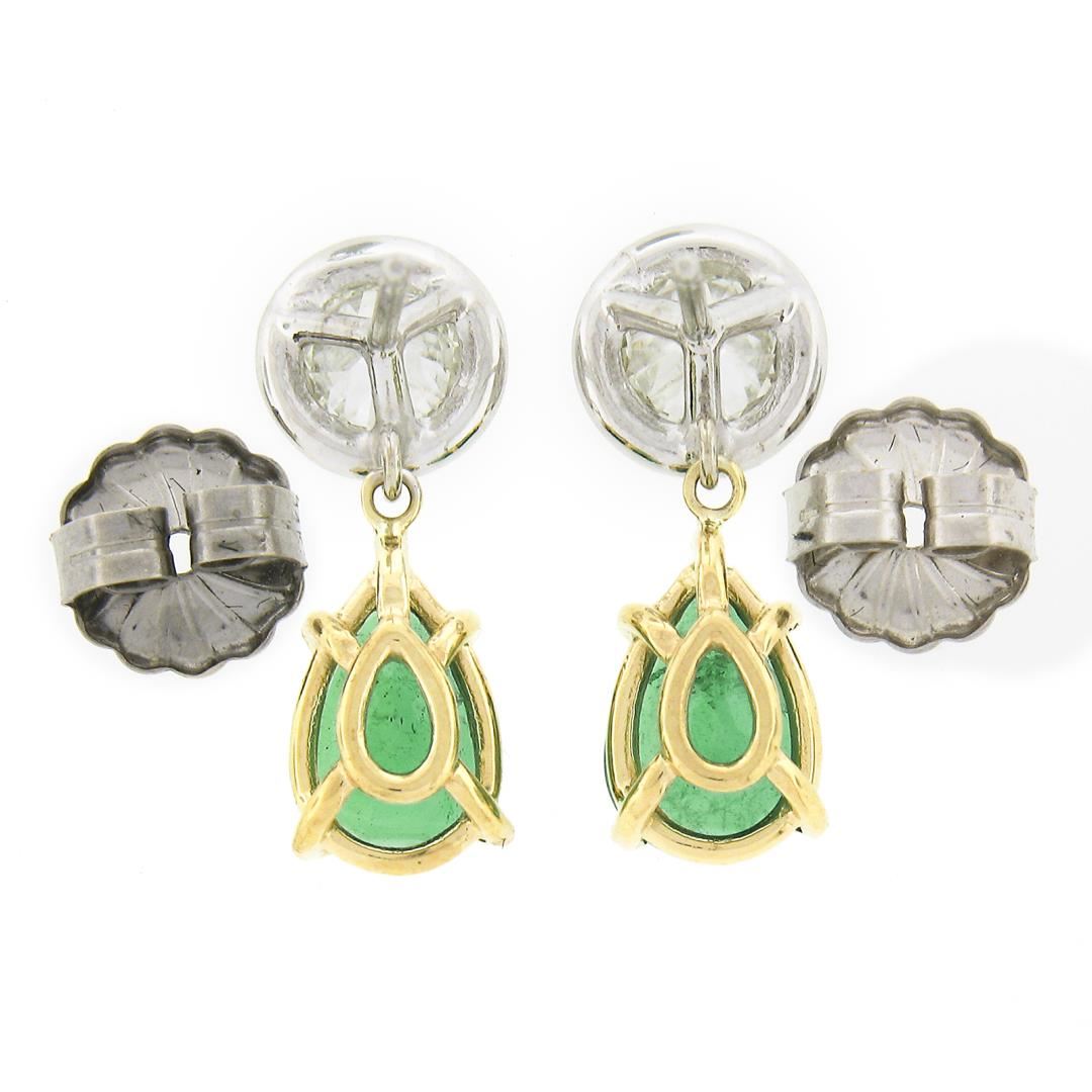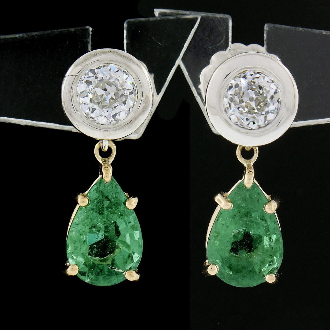 A new solid 14k yellow and white gold pair of dangle earrings, featuring GIA graded 2 pead cut natural emeralds (2.39ctw), and 2 GIA graded old European cut natural diamonds (H - VS1/VS2 ; 0.92ctw). The earrings measure approximately 18x6.95mm and weigh a total of 2.78 grams. Comes with all original relevant certifications.