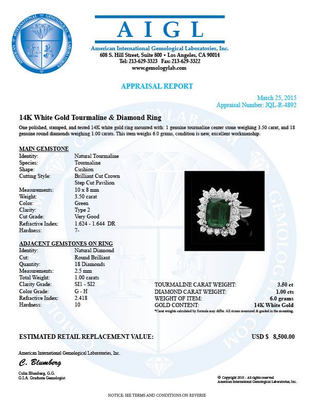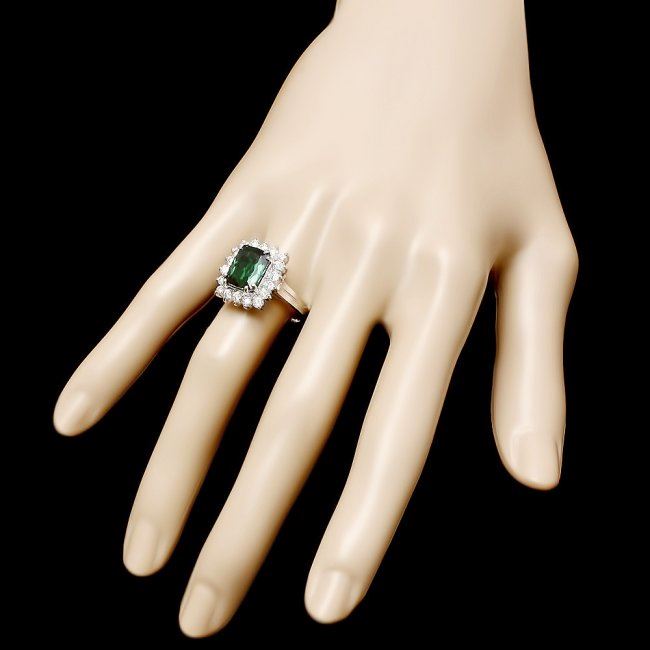Retail: $8,500.00 ****** 14k Gold 3.50ct Tourmaline 1.00ct Diamond Ring ****** Metal: 14k Solid White Gold / Size: 7 / Total Item Weight: 6 grams / Country Made: United States / / Main Stone: Tourmaline / Color: Green / Carat Total Weight: 3.50 / Treatment: None / Clarity: Type 2 / Cut: Very Good / / Secondary Stone: Diamond / Carat Total Weight: 1.00 / Treatment: None / Color Grade: G - H / Clarity: SI1 - SI2 / Cut: Very Good /