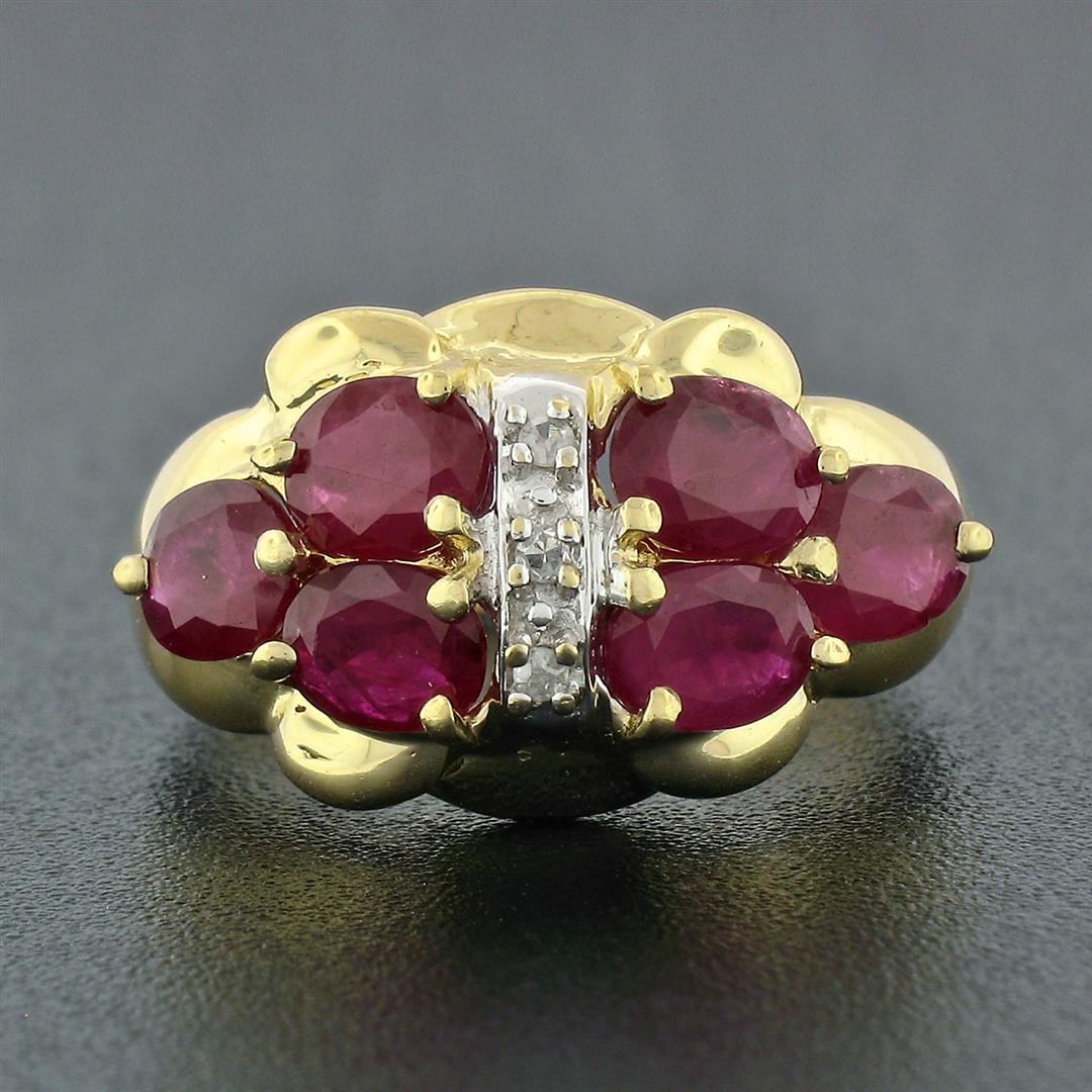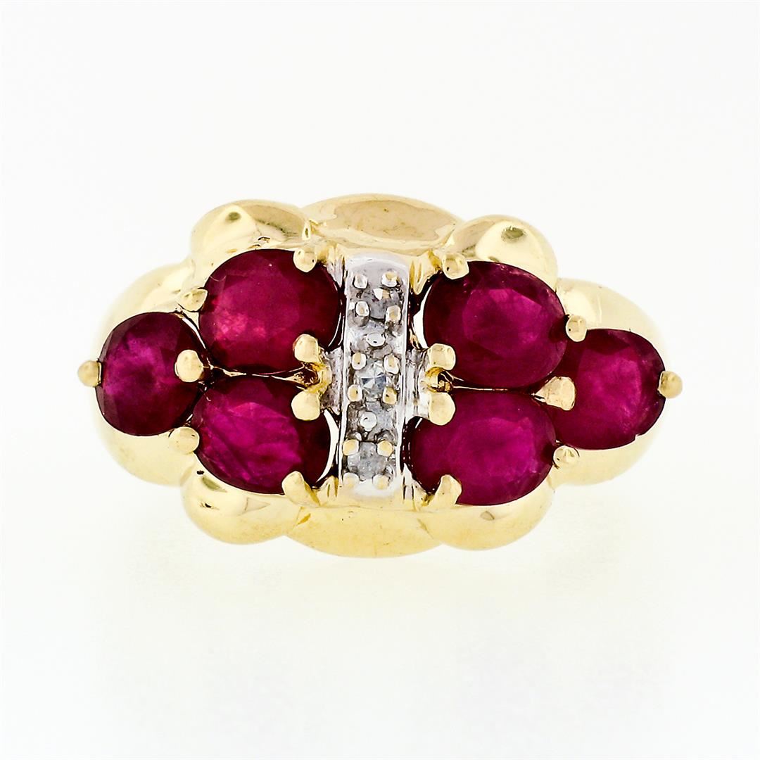 A solid 14k two tone gold ring with 6 oval cut natural rubies (3.60ctw) and a column of 3 round single cut natural diamonds (H - SI2/I1; 0.05ctw). The ring is size 5.0, weighs a total of 4.13 grams, and measures 11.94mm wide.