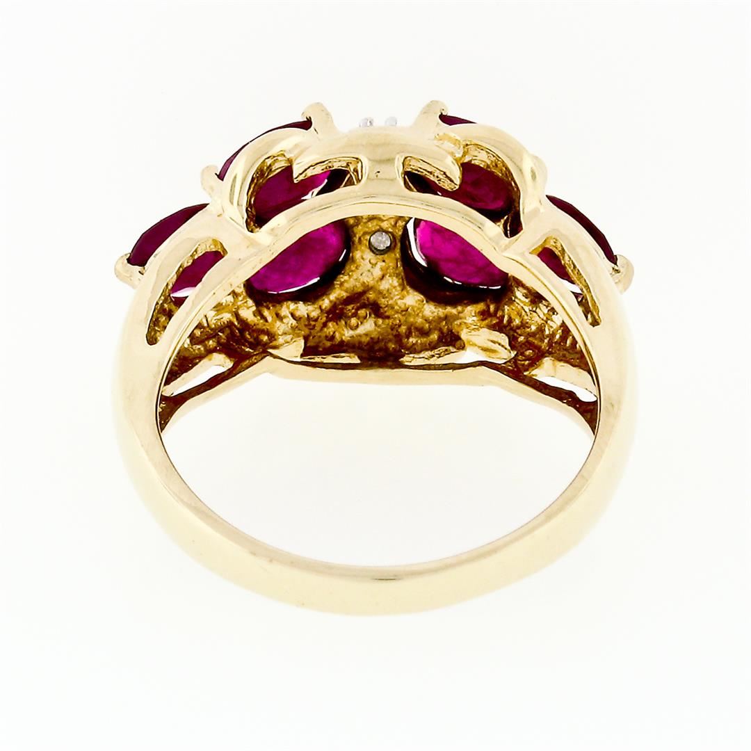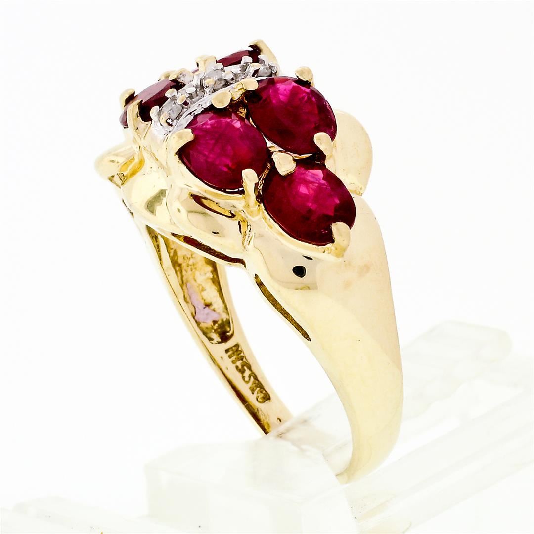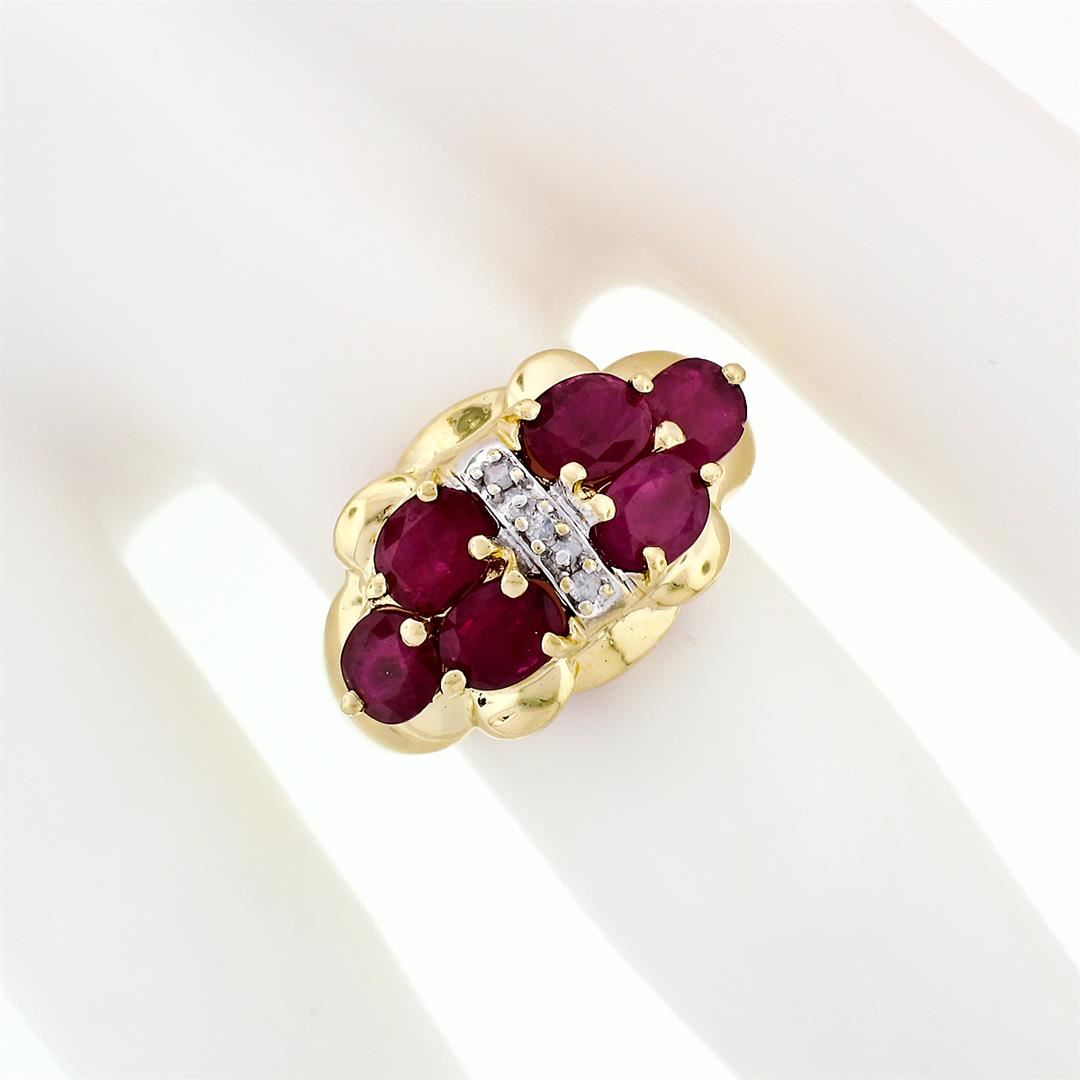 A solid 14k two tone gold ring with 6 oval cut natural rubies (3.60ctw) and a column of 3 round single cut natural diamonds (H - SI2/I1; 0.05ctw). The ring is size 5.0, weighs a total of 4.13 grams, and measures 11.94mm wide.