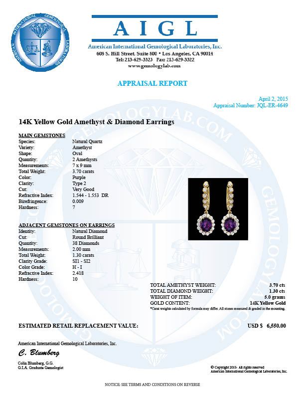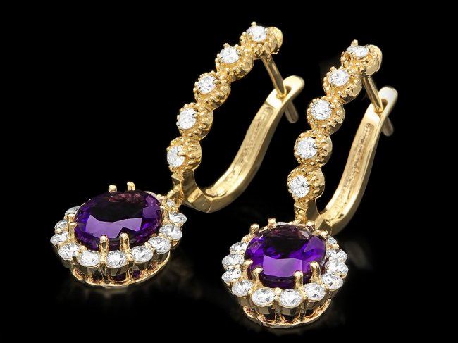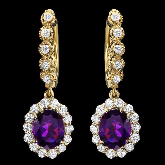 Retail: $6,500.00 ****** 14k Gold 3.70ct Amethyst 1.30ct Diamond Earrings ****** Metal: 14k Solid Yellow Gold / Total Item Weight: 5 grams / Country Made: United States / / Main Stone: Amethyst / Color: Purple / Carat Total Weight: 3.70 / Treatment: None / Clarity: Type 2 / Cut: Very Good / / Secondary Stone: Diamond / Carat Total Weight: 1.30 / Treatment: None / Color Grade: H - I / Clarity: SI1 - SI2 / Cut: Very Good /