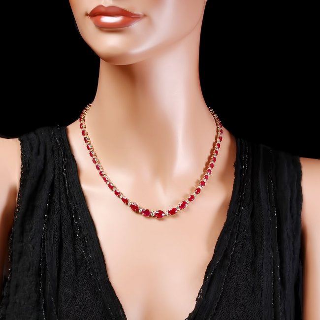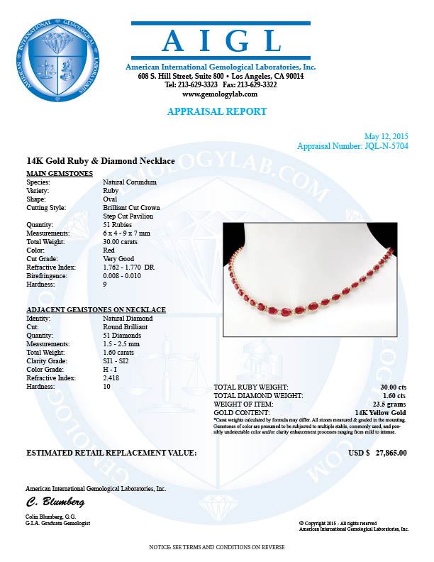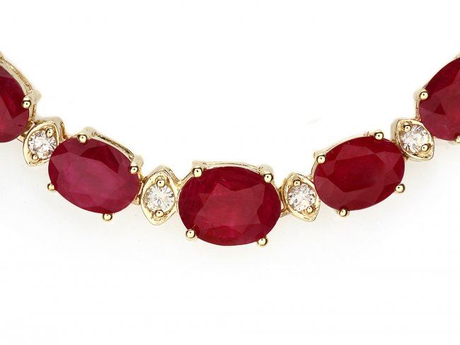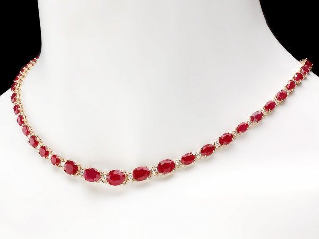 Retail: $27,800.00 ****** 14k Gold 30.00ct Ruby 1.60ct Diamond Necklace ****** Metal: 14k Solid Yellow Gold / Size: 17 / Total Item Weight: 23.5 grams / Country Made: United States / / Main Stone: Ruby / Color: Red / Carat Total Weight: 30.00 / Treatment: None / Clarity: Type 2 / Cut: Very Good / / Secondary Stone: Diamond / Carat Total Weight: 1.60 / Treatment: None / Color Grade: H - I / Clarity: SI1 - SI2 / Cut: Very Good /