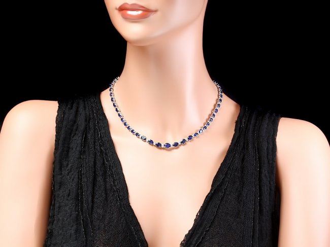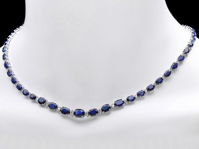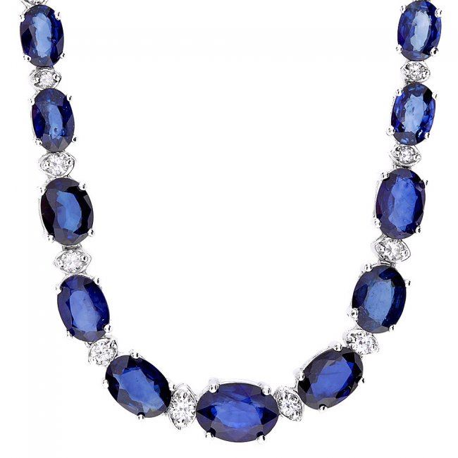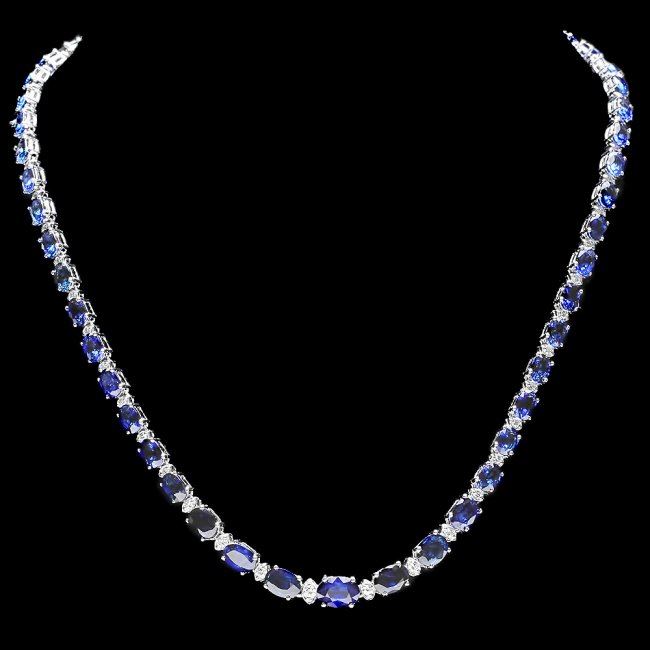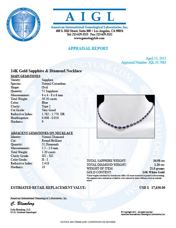 Retail: $17,500.00 ****** 14k Gold 30ct Sapphire 1.20ct Diamond Necklace ****** Metal: 14k Solid White Gold / Size: 17 / Total Item Weight: 21.0 grams / Country Made: United States / / Main Stone: Sapphire / Color: Blue / Carat Total Weight: 30.50 / Treatment: Diffusion / Clarity: Type 2 / Cut: Very Good / / Secondary Stone: Diamond / Carat Total Weight: 1.20 / Treatment: None / Color Grade: H - I / Clarity: SI1 - SI2 / Cut: Very Good /