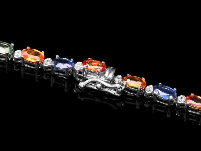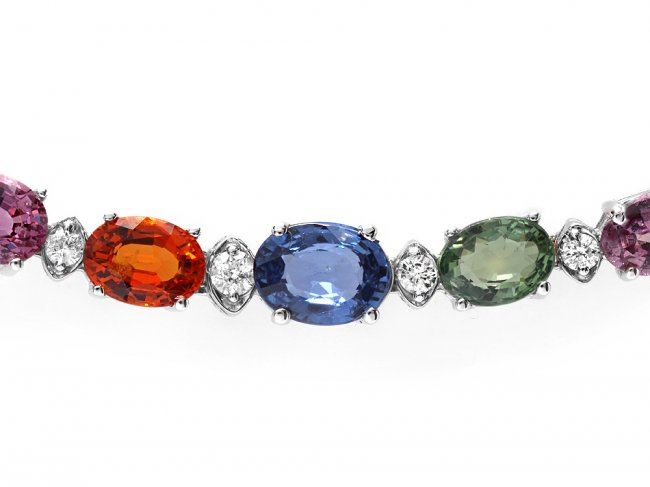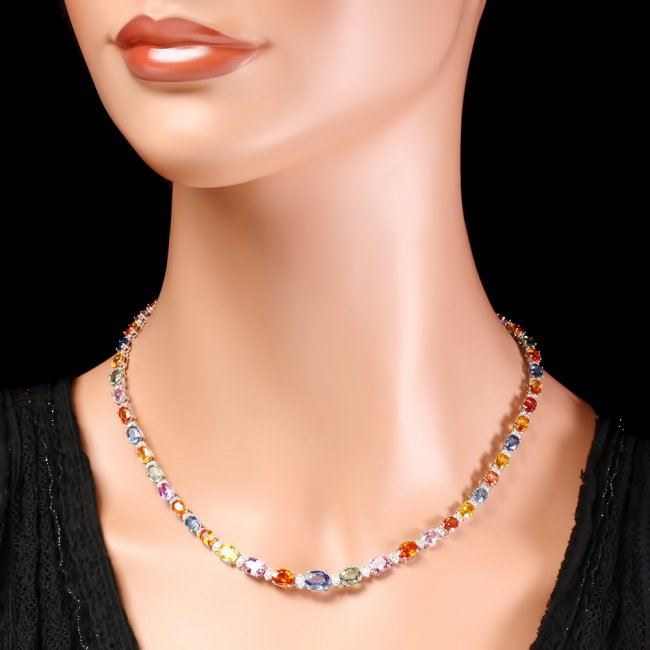 Retail: $21,650.00 ****** 14k Gold 31ct Sapphire 1.20ct Diamond Necklace ****** Metal: 14k Solid White Gold / Size: 17 / Total Item Weight: 21.0 grams / Country Made: United States / / Main Stone: Sapphire / Color: Multi-Colored / Carat Total Weight: 31.00 / Treatment: Heating / / Secondary Stone: Diamond / Carat Total Weight: 1.20 / Treatment: None / Color Grade: G - H / Clarity: SI1 - SI2 / Cut: Very Good /