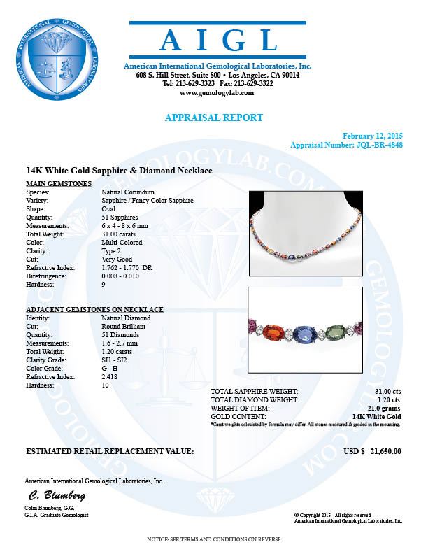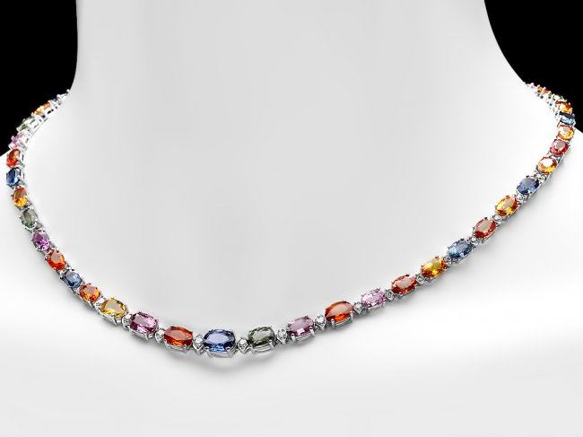 Retail: $21,650.00 ****** 14k Gold 31ct Sapphire 1.20ct Diamond Necklace ****** Metal: 14k Solid White Gold / Size: 17 / Total Item Weight: 21.0 grams / Country Made: United States / / Main Stone: Sapphire / Color: Multi-Colored / Carat Total Weight: 31.00 / Treatment: Heating / / Secondary Stone: Diamond / Carat Total Weight: 1.20 / Treatment: None / Color Grade: G - H / Clarity: SI1 - SI2 / Cut: Very Good /