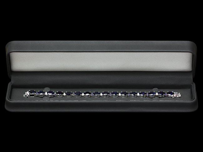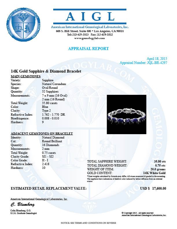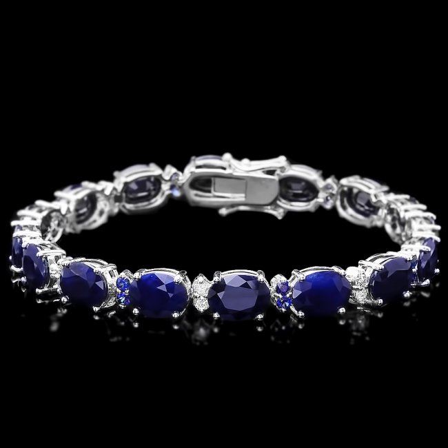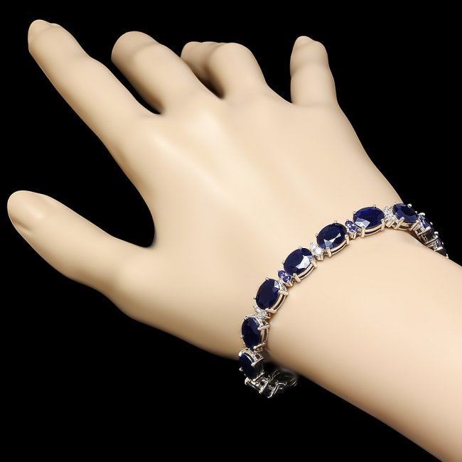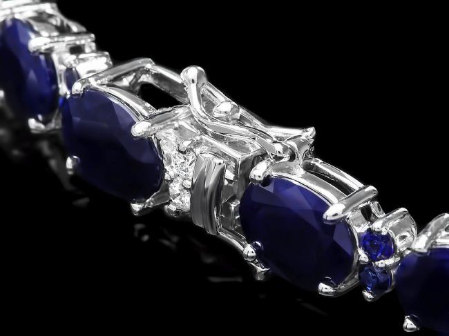 Retail: $17,500.00 ****** 14k Gold 35.8ct Sapphire 0.75ct Diamond Bracelet ****** Metal: 14k Solid White Gold / Size: 7.5 / Total Item Weight: 20 grams / Country Made: United States / / Main Stone: Sapphire / Color: Blue / Carat Total Weight: 35 / Treatment: Heating / Clarity: Type 2 / Cut: Very Good / / Secondary Stone: Diamond / Carat Total Weight: 0.75 / Treatment: None / Color Grade: H - I / Clarity: SI1 - SI2 / Cut: Very Good / / Side Stone: Sapphire / Color: Blue / Carat Total Weight: 0.80 / Treatment: Heating / Clarity: Type 2 / Cut: Very Good /