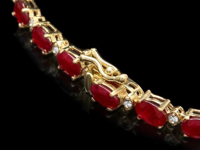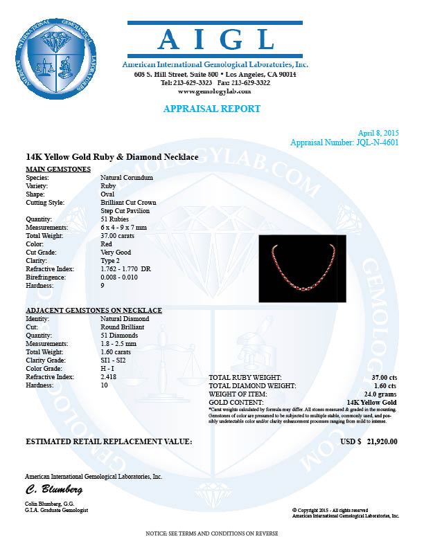 Retail: $21,800.00 ****** 14k Gold 37.00ct Ruby 1.60ct Diamond Necklace ****** Metal: 14k Solid Yellow Gold / Size: 17.5 / Total Item Weight: 24 grams / Country Made: United States / / Main Stone: Ruby / Color: Red / Carat Total Weight: 37.00 / Treatment: None / Clarity: Type 2 / Cut: Very Good / / Secondary Stone: Diamond / Carat Total Weight: 1.60 / Treatment: None / Color Grade: H - I / Clarity: SI1 - SI2 / Cut: Very Good /