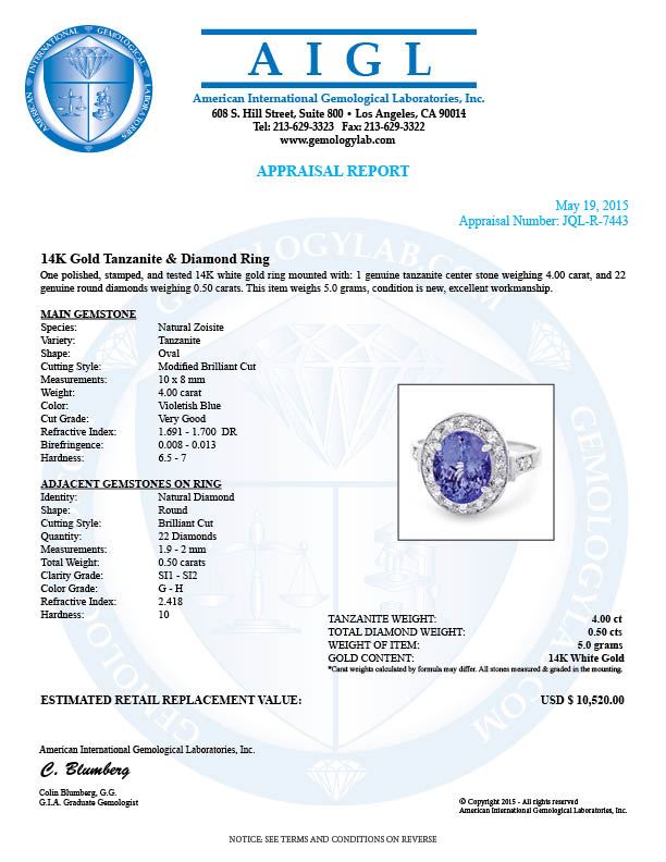 Retail: $10,400.00 ****** 14k Gold 4.00ct Tanzanite 0.50ct Diamond Ring ****** Metal: 14k Solid White Gold / Size: 7 / Total Item Weight: 5.0 grams / Country Made: United States / / Main Stone: Tanzanite / Color: Purple / Carat Total Weight: 4.00 / Treatment: None / Clarity: Type 2 / Cut: Very Good / / Secondary Stone: Diamond / Carat Total Weight: 0.50 / Treatment: None / Color Grade: G - H / Clarity: SI1 - SI2 / Cut: Very Good /