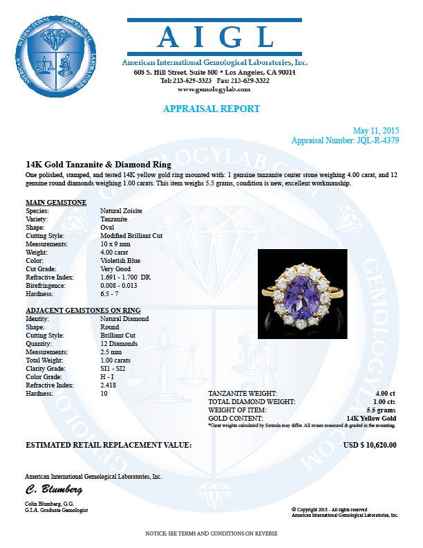 Retail: $10,500.00 ****** 14k Gold 4.00ct Tanzanite 1.00ct Diamond Ring ****** Metal: 14k Solid Yellow Gold / Size: 7.75 / Total Item Weight: 5.5 grams / Country Made: United States / / Main Stone: Tanzanite / Color: Blue / Carat Total Weight: 4.00 / Treatment: None / Clarity: Type 2 / Cut: Very Good / / Secondary Stone: Diamond / Carat Total Weight: 1.00 / Treatment: None / Color Grade: H - I / Clarity: SI1 - SI2 / Cut: Very Good /
