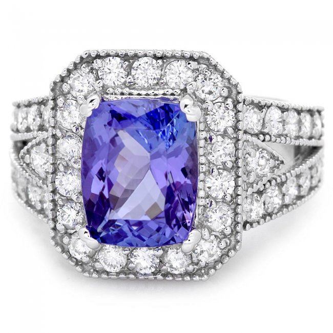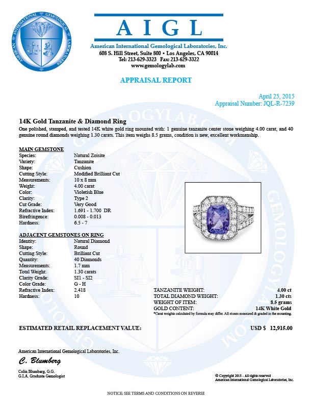 Retail: $12,850.00 ****** 14k Gold 4.00ct Tanzanite 1.30ct Diamond Ring ****** Metal: 14k Solid White Gold / Size: 6.5 / Total Item Weight: 8.5 grams / Country Made: United States / / Main Stone: Tanzanite / Color: Purple / Carat Total Weight: 4.00 / Treatment: None / Clarity: Type 2 / Cut: Very Good / / Secondary Stone: Diamond / Carat Total Weight: 1.30 / Treatment: None / Color Grade: G - H / Clarity: SI1 - SI2 / Cut: Very Good /