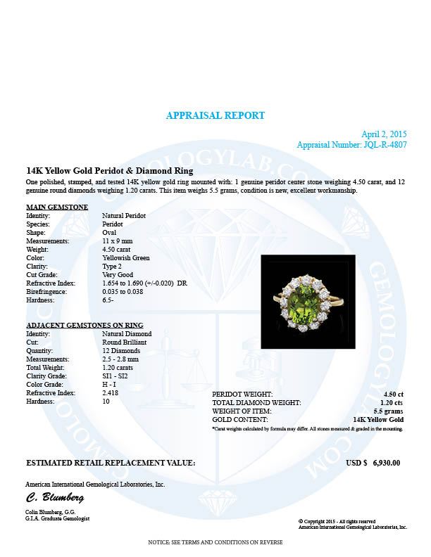 Retail: $6,800.00 ****** 14k Gold 4.50ct Peridot 1.20ct Diamond Ring ****** Metal: 14k Solid Yellow Gold / Size: 8 / Total Item Weight: 5.5 grams / Country Made: United States / / Main Stone: Peridot / Color: Green / Carat Total Weight: 4.50 / Treatment: None / Clarity: Type 2 / Cut: Very Good / / Secondary Stone: Diamond / Carat Total Weight: 1.20 / Treatment: None / Color Grade: H - I / Clarity: SI1 - SI2 / Cut: Very Good /