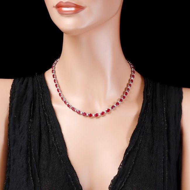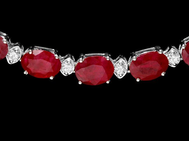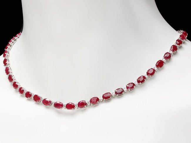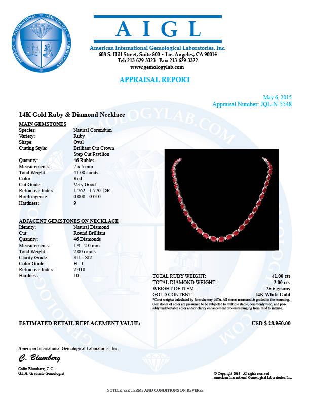 Retail: $28,840.00 ****** 14k Gold 41.00ct Ruby 2.00ct Diamond Necklace ****** Metal: 14k Solid White Gold / Size: 17.5 / Total Item Weight: 25.5 grams / Country Made: United States / / Main Stone: Ruby / Color: Red / Carat Total Weight: 41.00 / Treatment: None / Clarity: Type 2 / Cut: Very Good / / Secondary Stone: Diamond / Carat Total Weight: 2.00 / Treatment: None / Color Grade: H - I / Clarity: SI1 - SI2 / Cut: Very Good /