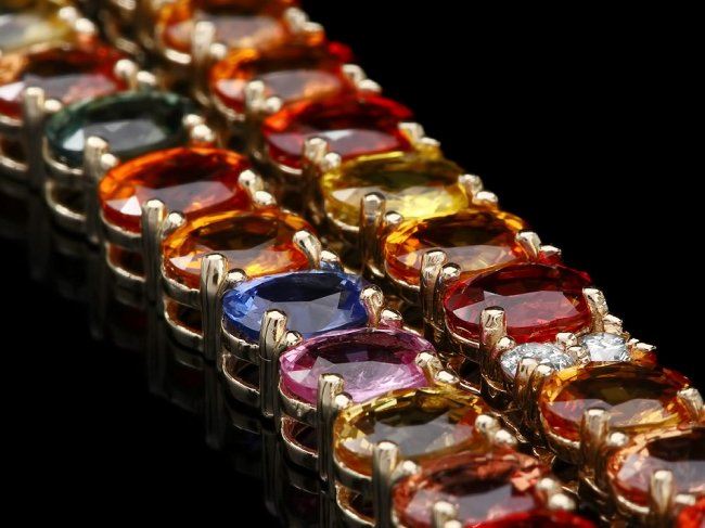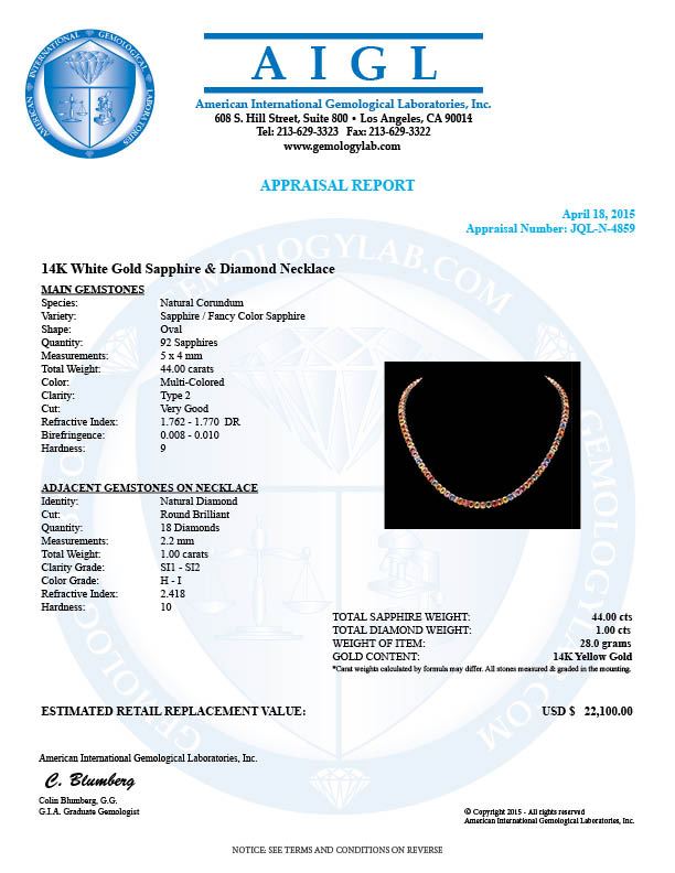 Retail: $22,000.00 ****** 14k Gold 44.00ct Sapphire 1.00ct Diamond Necklace ****** Metal: 14k Solid Yellow Gold / Size: 16.5 / Total Item Weight: 28 grams / Country Made: United States / / Main Stone: Sapphire / Color: Multi-Colored / Carat Total Weight: 44.00 / Treatment: Heating / / Secondary Stone: Diamond / Carat Total Weight: 1.00 / Treatment: None / Color Grade: H - I / Clarity: SI1 - SI2 / Cut: Very Good /