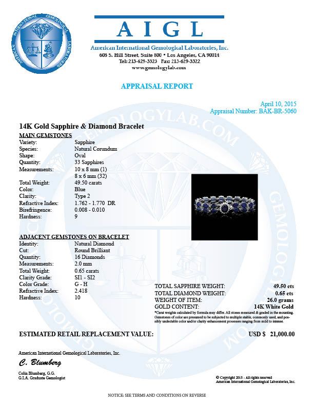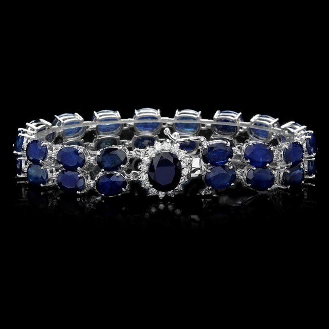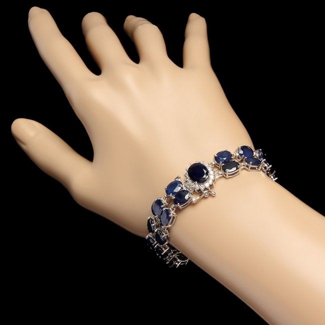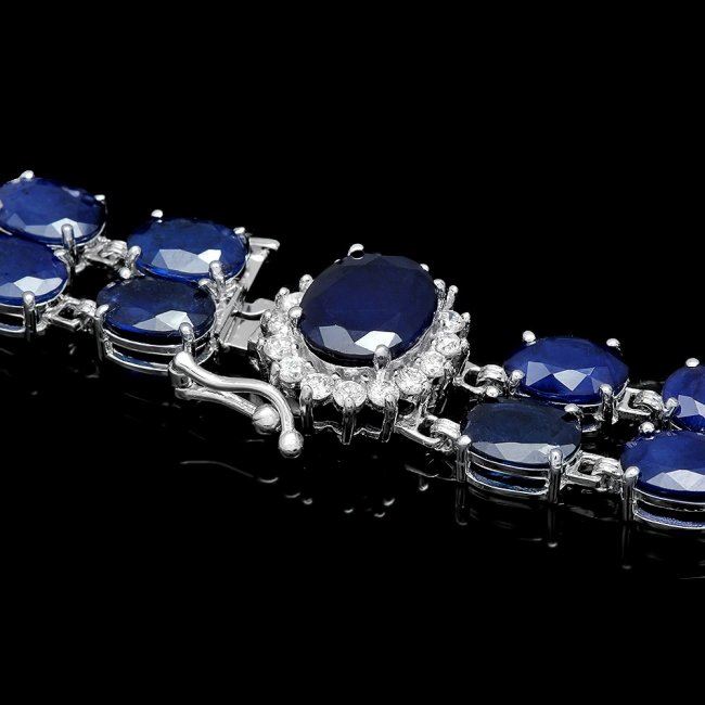 Retail: $20,900.00 ****** 14k Gold 49.5ct Sapphire 0.65ct Diamond Bracelet ****** Metal: 14k Solid White Gold / Size: 7 / Total Item Weight: 26.0 grams / Country Made: United States / / Main Stone: Sapphire / Color: Blue / Carat Total Weight: 3.00 / Treatment: Heating / Clarity: Type 2 / Cut: Very Good / / Secondary Stone: Diamond / Carat Total Weight: 0.65 / Treatment: None / Color Grade: G - H / Clarity: SI1 - SI2 / Cut: Very Good / / Side Stone: Sapphire / Color: Blue / Carat Total Weight: 46.50 / Treatment: Heating / Clarity: Type 2 / Cut: Very Good /