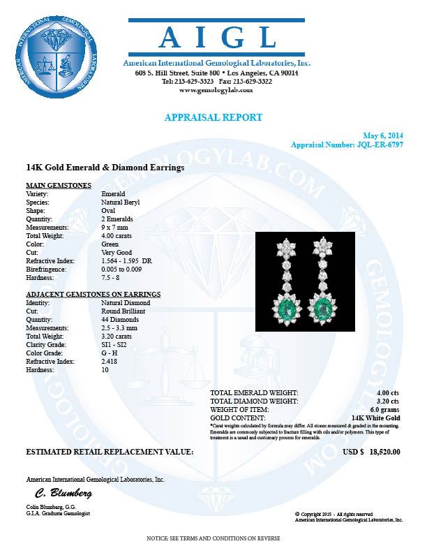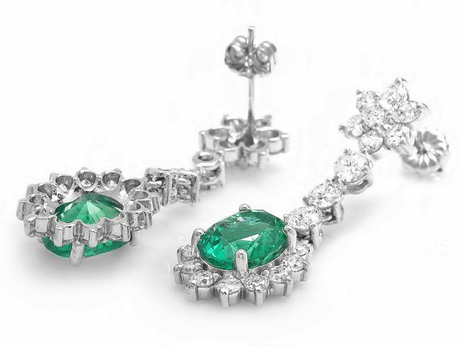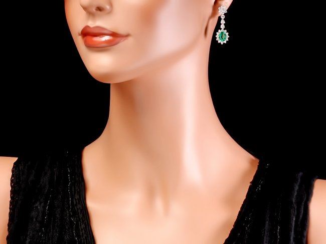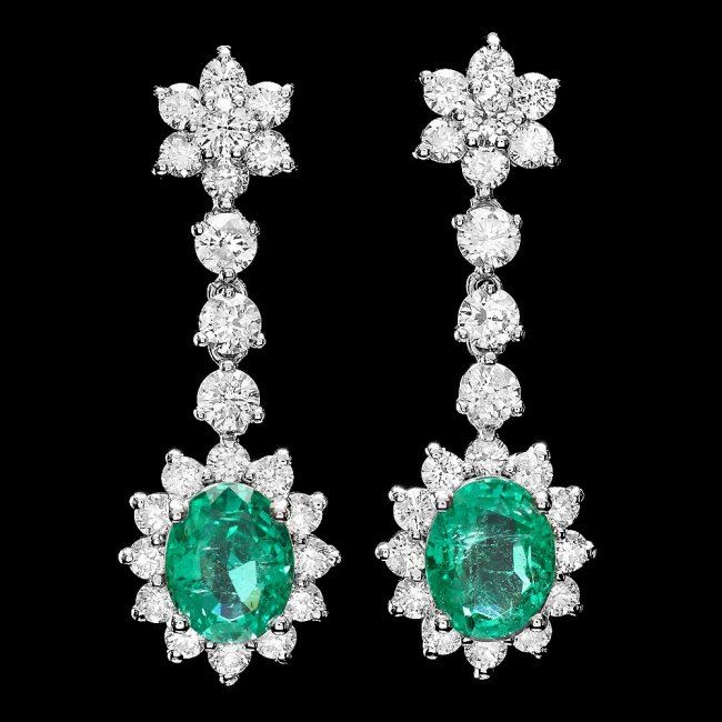 Retail: $18,400.00 ****** 14k Gold 4ct Emerald 3.20ct Diamond Earrings ****** Metal: 14k Solid White Gold / Total Item Weight: 6.0 grams / Country Made: United States / / Main Stone: Emerald / Color: Green / Carat Total Weight: 4.00 / Treatment: None / Clarity: Type 2 / Cut: Very Good / / Secondary Stone: Diamond / Carat Total Weight: 3.20 / Treatment: None / Color Grade: G - H / Clarity: SI1 - SI2 / Cut: Very Good /
